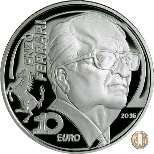 10 Euro 2016 Enzo Ferrari Dritto: Volto che rappresenta l’Italia all’interno di una stella a cinque punte con elementi dello stemma della Repubblica: ruota dentata e rami di quercia e ulivo; sopra, tra due punte della stella, corona turrita; sotto, logo di Europa Star Programme e nome dell’autore, «COLANERI»; in basso a destra, «R»; nel giro, «REPUBBLICA ITALIANA». Verso: Ritratto di Enzo Ferrari di tre quarti a destra; a sinistra, cavallino rampante e, su due righe in verticale, «ENZO» / «FERRARI»; a destra, «2016»; in basso, «10 EURO». | |