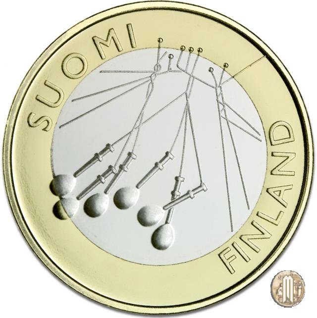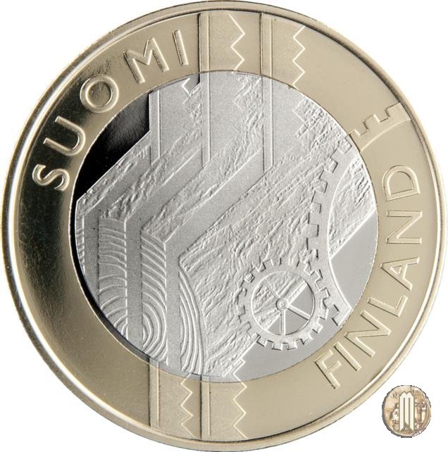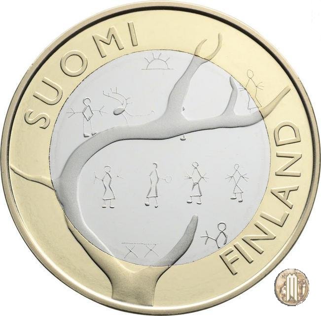 5 Euro 2011 Lapin - Suomen maakuntarahalla Dritto: In primo piano un albero spoglio, sullo sfondo rappresentazione stilizzata di personaggi. Sul giro la legenda 'SUOMI FINLAND'. Verso: Al centro: stemma della provincia e iniziale dell'autore. A sinistra e in basso in circolo: valore facciale. A destra: simbolo di zecca. In alto, in circolo: anno di emissione. | |