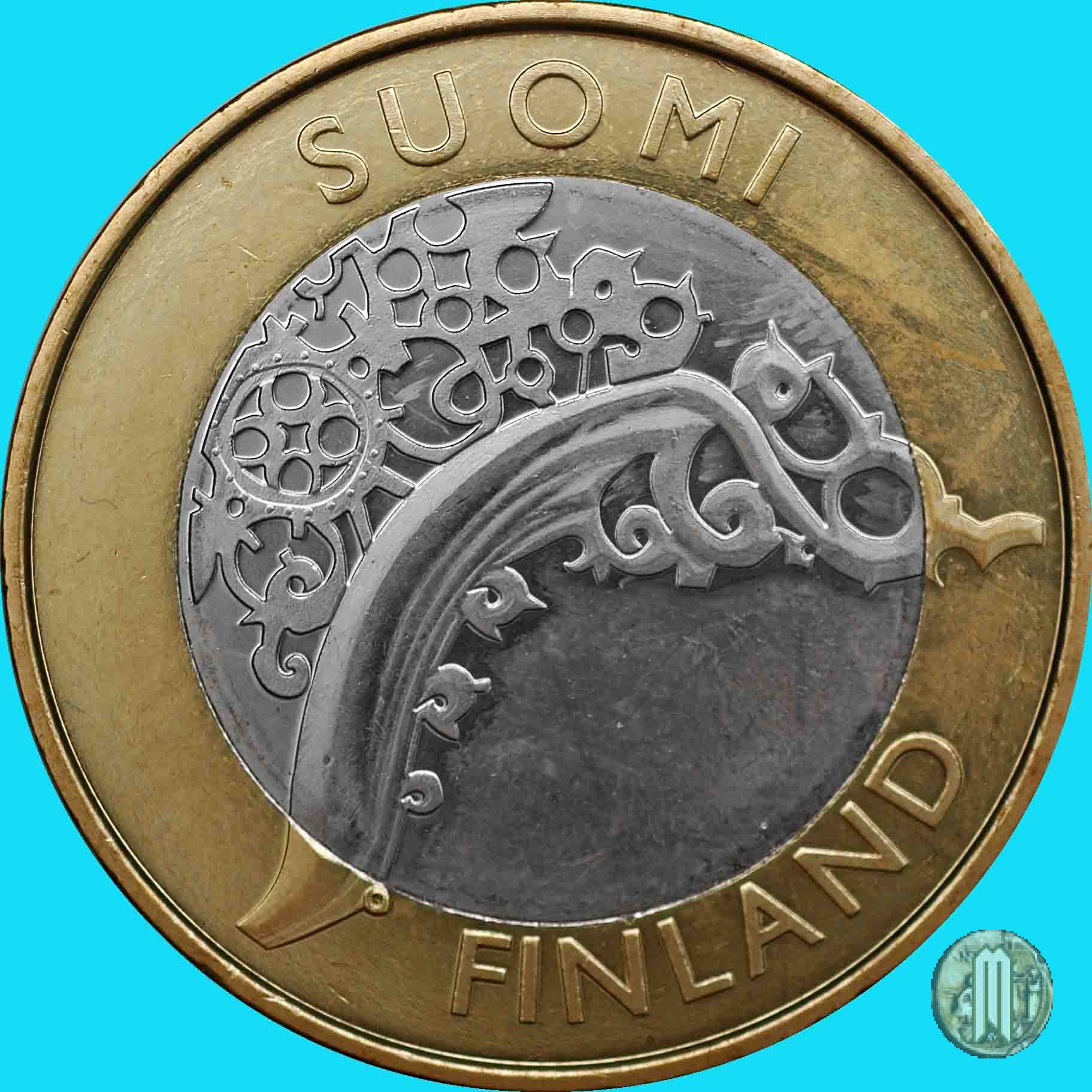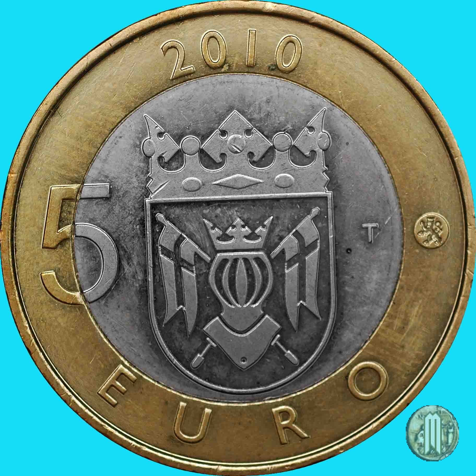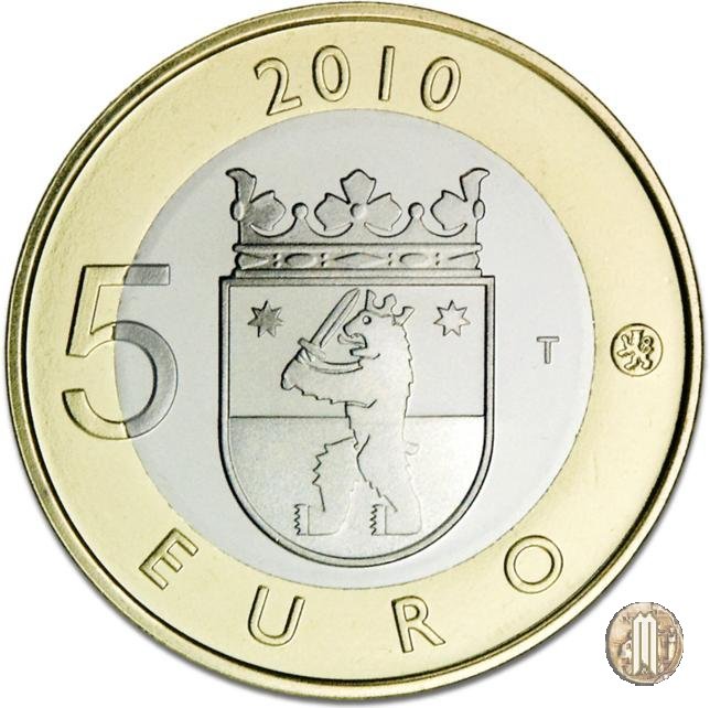 5 Euro 2010 Varsinais - Suomen maakuntarahalla Dritto: Al centro: dettaglio della coppa di Rusko. In circolo esterno: nome dello stato. Verso: Al centro: stemma della provincia e sigla autore. A sinistra e in basso in circolo: valore facciale. A destra: simbolo di zecca. In alto, in circolo: anno di emissione. | |