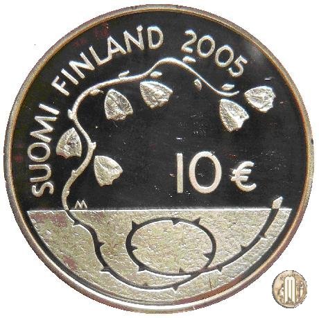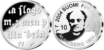 10 Euro 2004 Johan Ludvig Runeberg Dritto: Particolare di uno scritto sul Helsingfors Tidningar, giornale in lingua Svedese su cui Runeberg scrisse la maggior parte delle sue opere in Svedese. Verso: Ritratto stilizzato del viso di Runeberg (letterato, 1804-1877). Iscrizione: 2004 SUOMI FINLAND - J.L.RUNEBERG 1804 1877 • | |