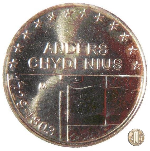 10 Euro 2003 Anders Chydenius Dritto: Scultura di un libro aperto a rappresentare le varie pubblicazioni di Chydenius (Sacerdote, economista e membro del Parlamento, 1729-1803) con le 12 stelle della U.E. Iscrizioni ANDERS CHYDENIUS Verso: Scultura di un villaggio tradizionale, con una chiesa ed altre costruzioni. Iscrizioni SUOMI FINLAND 2003 10 EURO. | |