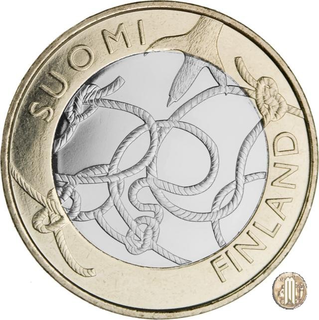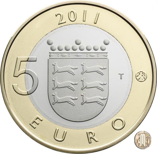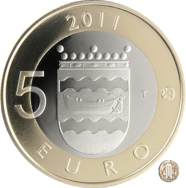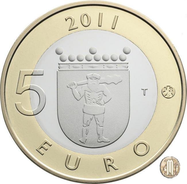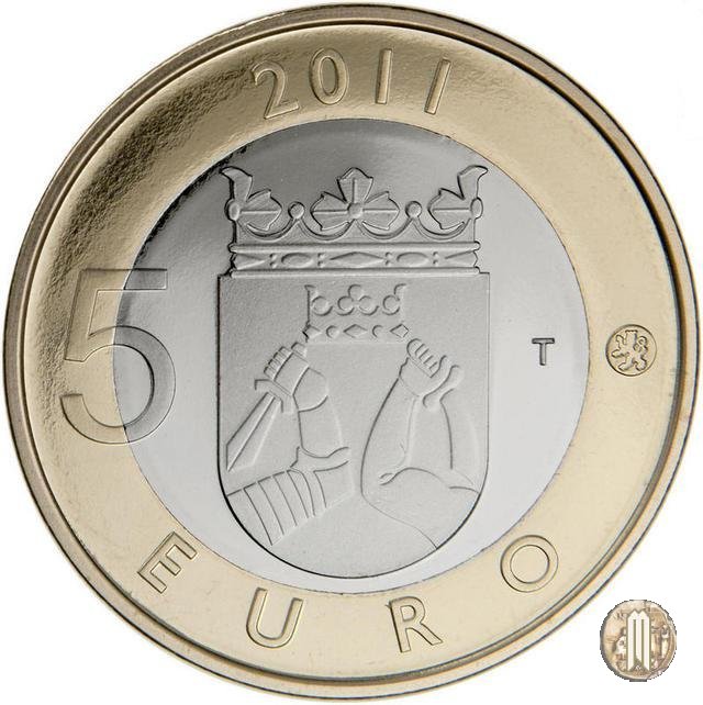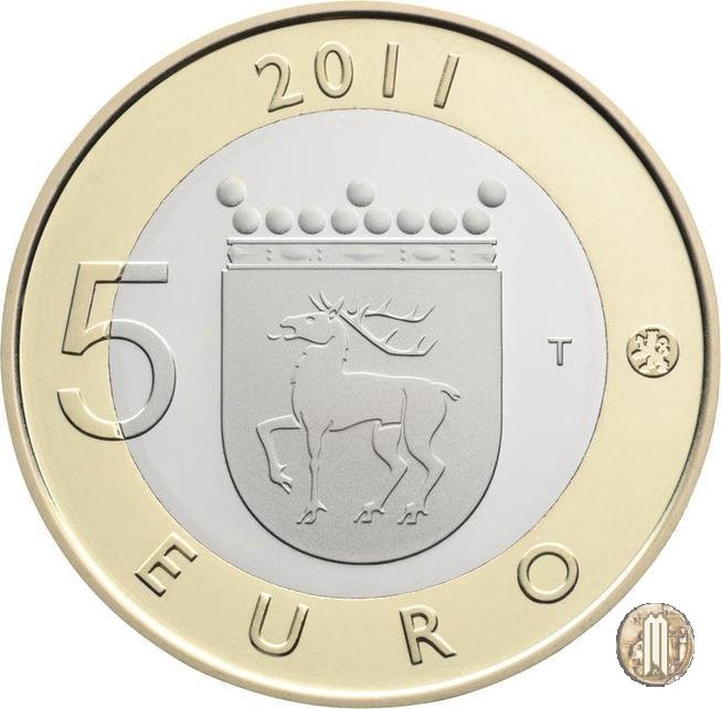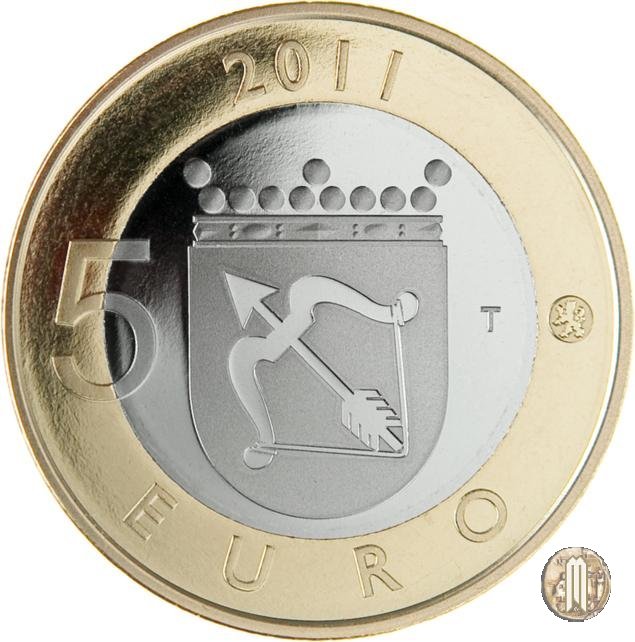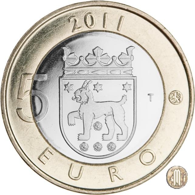 5 Euro 2011 Tavastia - Suomen maakuntarahalla Dritto: Un insieme di corde e nodi, in alto artigli di un uccello. Sul giro la legenda SUOMI FINLAND. Verso: Al centro: stemma della provincia e iniziale dell'autore. A sinistra e in basso in circolo: valore facciale. A destra: simbolo di zecca. In alto, in circolo: anno di emissione. | |