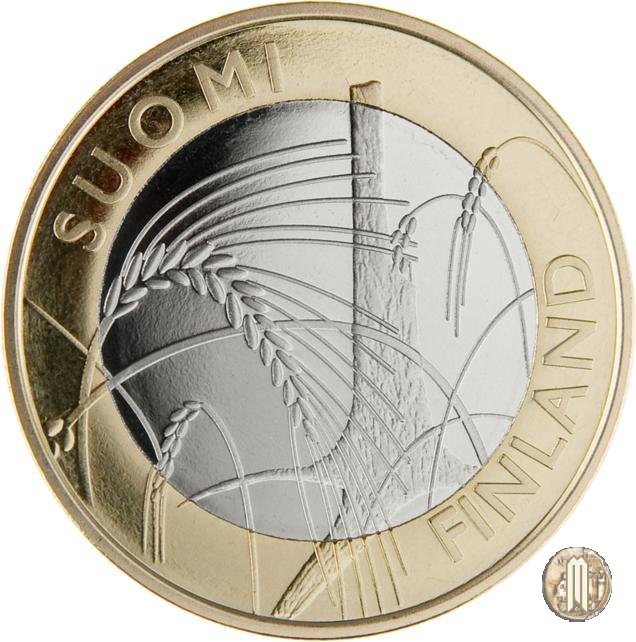 5 Euro 2011 Savon - Suomen maakuntarahalla Dritto: Spighe e i resti di un albero bruciato, simbolo dell'agricoltura. Sul giro la legenda SUOMI FINLAND. Verso: Al centro: stemma della provincia e iniziale dell'autore. A sinistra e in basso in circolo: valore facciale. A destra: simbolo di zecca. In alto, in circolo: anno di emissione. | |