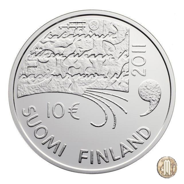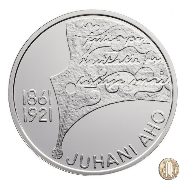10 Euro 2011 Juhani Aho, ja suomalainen kirjallisuus Dritto: Nel campo superiore scritto stilizzato, a destra anno di emissione, nel campo inferiore a sinistra il valore nominale, sul giro la legenda SUOMI FINLAND, in alto simbolo di zecca. Verso: Al centro forma stilizzata di un pennino che termina in uno scritto, a sinistra le date 1861 1921 su due righe, sul giro basso verso destra la legenda JUHANI AHO. | |