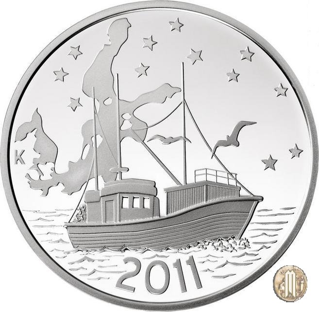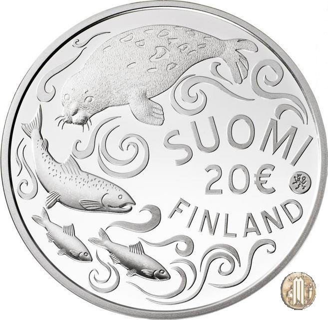 20 Euro 2011 Itämeren suojelu - juhlaraha Dritto: Raffigurazione di pesci e animali marini, al centro destra la scritta SUOMI arcata verso l'alto e sotto la scritta FINLAND arcata verso il basso in mezzo il valore nominale e alla sua destra il simbolo di zecca. Verso: Al centro un'imbarcazione da pesca, nel campo superiore a sinistra la forma stilizzata del Mar Baltico e in alto stelle e gabbiani, a sinistra l'iniziale K dell'autore, in basso l'anno di emissione. | |