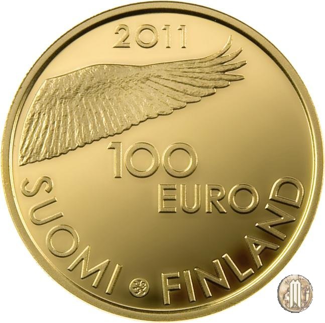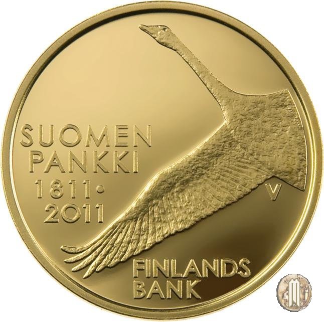 100 Euro 2011 Suomen Pankki 200 vuotta Dritto: Nel campo superiore l'ala sinistra del cigno, in alto l'anno di emissione, al centro il valore nominale, sul giro inferiore la legenda SUOMI FINLAND tra le due parole della legenda il segno di zecca. Verso: Raffigura l'uccello nazionale finlandese un 'cigno', a sinistra su quattro righe la legenda SUOMEN PANKKI 1811 2011 in basso la legenda FINLANDS BANK su due righe. | |