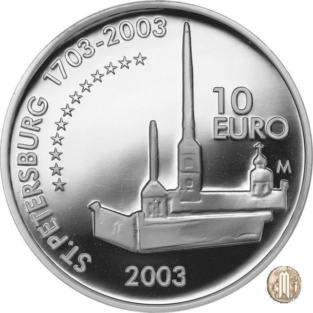 10 Euro 2003 Mannerheim e San Pietroburgo Dritto: Ritratto del Maresciallo Carl Gustaf Emil Mannerheim. Verso: Vista di San Pietroburgo con la Fortezza di Pietro e Paolo e le sue tre torrette. Iscrizioni: ST. PETERSBURG 1703-2003 | |