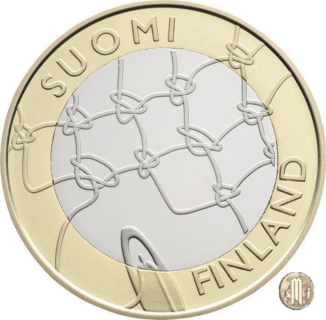 5 Euro 2011 Åland - Suomen maakuntarahalla Dritto: In primo piano una rete da pescatore nella fase della realizzazione, a simboleggiare l'arte della pesca. Sul giro la legenda 'SUOMI FINLAND'. Verso: Al centro: stemma della provincia e iniziale dell'autore. A sinistra e in basso in circolo: valore facciale. A destra: simbolo di zecca. In alto, in circolo: anno di emissione. | |