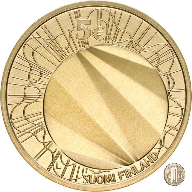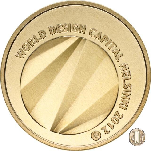 5 Euro 2012 World Design Capital Helsinki 2012 Dritto: Rappresentazione grafica di un'insieme di linee concentriche e contrapposte in un cerchio posto al centro della moneta che è spostato verso il basso e a destra, sulla parte esterna una serie di linee a diverse distanze tra loro partono dal centro verso l'esterno, due linee ondulate circondano la parte centrale. In alto il valore nominale, sul giro in basso verso destra la legenda SUOMI FINLAND, a sinistra iniziale 'L' dell'autore. Verso: Stessa rappresentazione della parte centrale del dritto. Posta in semicerchio attorno la parte centrale la legenda WORLD DESING HELSINKI 2012 segue il segno di zecca. | |