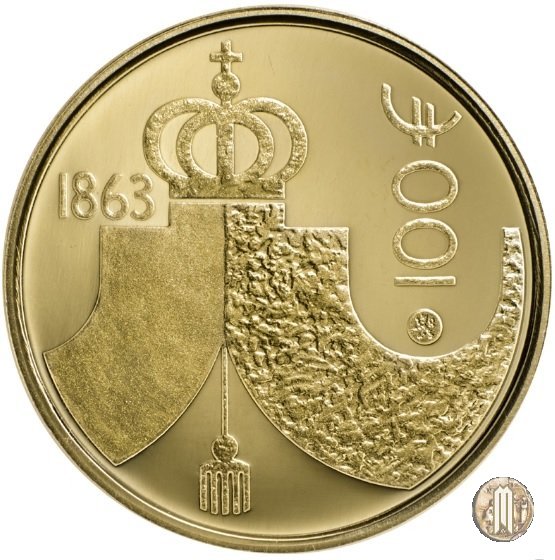Corona e tenda che si apre, rappresentante il potere dell'Imperatore di Russia • "1863", "100€", segno di zecca | |