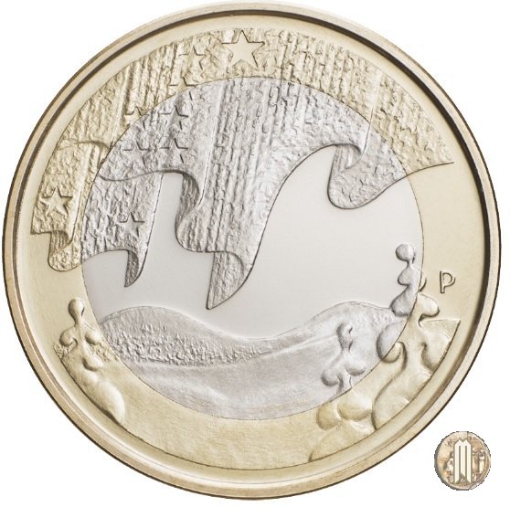 2 Euro 2007 90° Anniversario dell'Indipendenza Dritto: Una barca a remi lunghi, sulla quale nove persone vogano verso sx attraverso i flutti. Sopra, "2007", sotto, "1917". A dx "FI" (sigla identificativa della Finlandia); a sx il segno di zecca (una cornucopia). Intorno le 12 stelle simbolo dell'UE. Verso: Faccia comune ( NUOVO DISEGNO ) | |