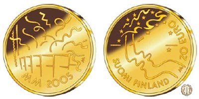 20 Euro 2005 10° Campionato Mond. Atletica Dritto: Stadio Olimpico di Helsinki con sopra delle nuvole stilizzati. Verso: Due visi stilizzati con sopra i capelli le 12 stelle dell'Unione Europea. | |