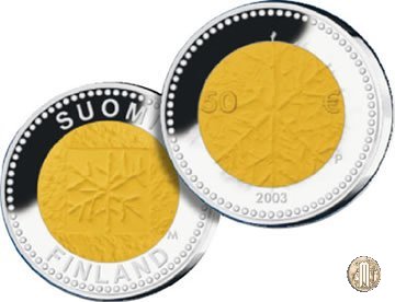 50 Euro 2003 Arte Numismatica Finlandese Dritto: Fiocco di neve, rappresentazione caratteristica della localizzazione nordica del Paese. Nell'anello esterno perline, elemento tipico dell'arte numismatica Finlandese. Verso: Altro disegno di fiocco di neve. Nell'anello esterno perline, elemento tipico dell'arte numismatica Finlandese. | |
