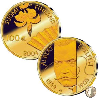100 Euro 2004 150° nascita Albert Edelfelt Dritto: Volto del Pittore (1854 - 1905). Verso: Fiore pendente e angolo di un ventaglio, entrambi simboli di bellezza. | |