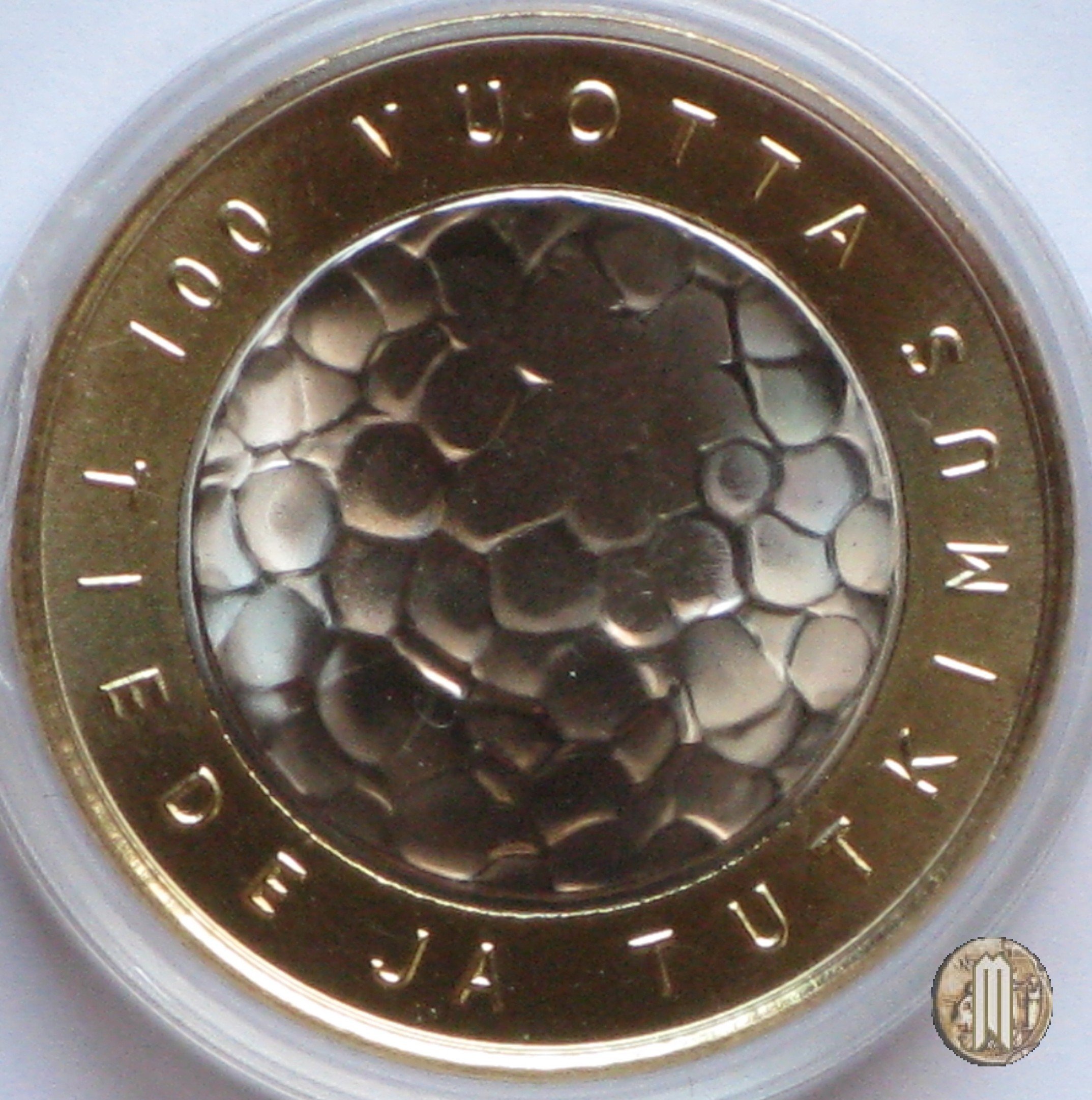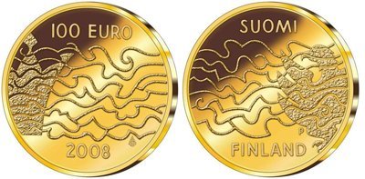 100 Euro 2008 200° Anniv.Guerra di Finlandia Dritto: Rappresentazione dell'Aquila Finlandese, nel bicentenario della Guerra di Finlandia (Feb. 1808-Sett. 1809) tra Svezia e Russia che sancí, con la vittoria russa, la costituzione del Gran Ducato autonomo di Finlandia all'interno dell'Impero Russo. Verso: Ritiro della Corona Svedese. | |