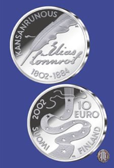 10 Euro 2002 Elias Lonnrot Dritto: Piuma per scrivere e firma di Elias Lonnrot (poeta, 1802-1884). Iscrizione KANSANRUNOUS (Poesia del Popolo. Verso: Nastro in tessuto con le 12 stelle dell'Unione EuropeaIscrizione: SUOMI FINLAND 2002 - 10 EURO | |