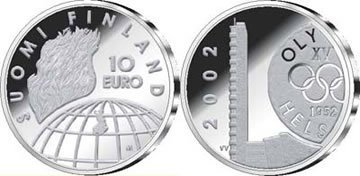 10 Euro 2002 50° Ann.Giochi Olimpici Helsinki Dritto: Vista dello Stadio Olimpico di Helsinki, con alla destra particolare della moneta commemorativa emessa nel 1952. Verso: La Terra con sopra la Fiamma Olimpica. Iscrizione: SUOMI FINLAND 10 EURO | |