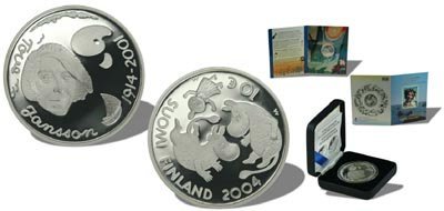 10 Euro 2004 Tove Jansson Dritto: Ritratto della scrittrice (1914-2001)con l'orizzonte, una tavolozza, una mezzaluna ed una barca a vela. Verso: Alcuni personaggi dei "Moomins". Iscrizione: SUOMI FINLAND 2004 10 | |