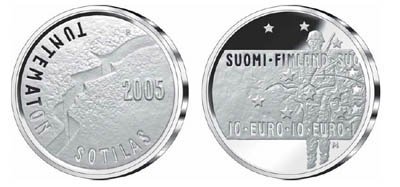 10 Euro 2005 Milite Ignoto e Arte Cinematografica Dritto: Soldato stilizzato in uniforme sull'attenti, a forma di filmstrip. Iscrizione: TUNTEMATON SOTILAS (milite ignoto). Verso: Trincea in un campo di battaglia scolpita sotto il viso di un soldato con elmetto. Iscrizione: SUOMI-FINLAND-SUO 10-EURO-10EURO-1 | |