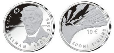 10 Euro 2006 Johan Vilhelm Snellman Dritto: Prifilo di Johan Vilhelm Snellman (12 Maggio 1806 - 4 Luglio 1881), filosofo, scrittore, giornalista e statista. Iscrizioni: J.V.SNELLMAN 1806 2006 ![]() ![]() Verso: Rappresentazione dell'alba della cultura Finlandese. | |