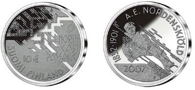 10 Euro 2007 A.E.Nordenskiold e Passaggio a NordEs Dritto: Ritratto astratto di Adolf Erik Nordenskiold nel 175° anno della nascita (1832-1901), esplorratore Finlandere che scopri il Passaggio a NordEst. Iscrizioni: 1832-1901 A.E.Nordenskiold 2007 ![]() ![]() Verso: Labirinto formato da blacchi adiacenti di ghiaccio. Iscrizioni: NORTH.EAST PASSAGE - 10 Eur - SUOMI FINLAND | |