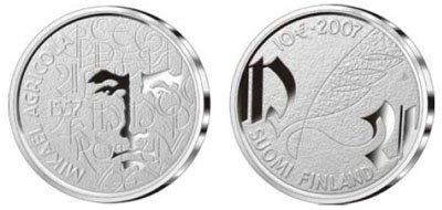 10 Euro 2007 Mikael Agricola e la lingua Finlandes Dritto: Ritratto stilizzato di Mikael Agricola che contribuí alla Riforma Protestante in Finlandia e padre della Lingua scritta Finlandese.450° anniversario della nascita. Iscrizioni: Mikael Agricola 1557 Verso: Cannello per scrivere. Iscrizioni: 10 Eur 2007 SUOMI FINLAND | |