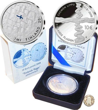 10 Euro 2008 90° Anniv.Bandiera Finlandese Dritto: La Bandiera Finlandese in mezzo ad altre bandiere. Nel 90° anniversario della adozione della Bandiera Finlandese. Iscrizioni:SUOMI FINLAND 2008 ![]() ![]() Verso: La Natura Finlandese disegnata a forma di Croce. Iscrizioni: SUOMEN LIPPU - FINLAND FLAGGA (bandiera Finlandese)1918-2008 | |