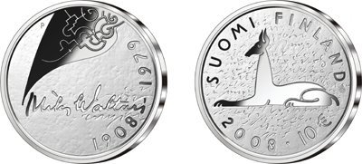 10 Euro 2008 Mika Waltari Dritto: Penna con firma di Mika Waltari, nel 100° anniversario della nascita (1908-1979), scrittore la cui opera principale fu "L'Egiziano" pubblicato nel 1945. Verso: Cane Egigio che vigila sul Faraone, con riferimento al libro di Waltari. Iscrizioni: SUOMI FINLAND 2008 10 EURO | |