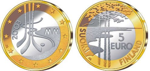 5 Euro 2003 Mondiali Hockey su Ghiaccio Dritto: Tre racchette con disco da hockey. 2003 Verso: Paesaggio lacustre con tre alberi. Iscrizioni: SUOMI FINLAND 5 EURO | |