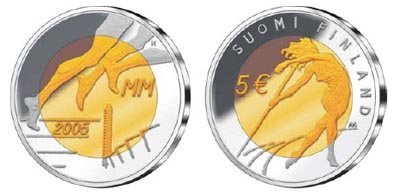 5 Euro 2005 10° Campionato Mond. Atletica Dritto: Stadio Olimpico di Helsinki e gambe di atleti che corrono. Verso: Lanciatore di giavellotto. Iscrizioni: SUOMI FINLAND 5 Euro | |