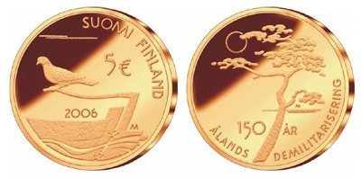 5 Euro 2006 150° Demilitarizzazione Aland Dritto: Albero di pino, tipico delle Isole Aland. Iscrizioni: 150 AR - ALANDS DEMILITARISERING Verso: Poppa di una barca con timone, con una colomba appoggiata sul braccio del timone stesso. Iscrizioni: SUOMI FINLAND - 5 EURO - 2006 | |