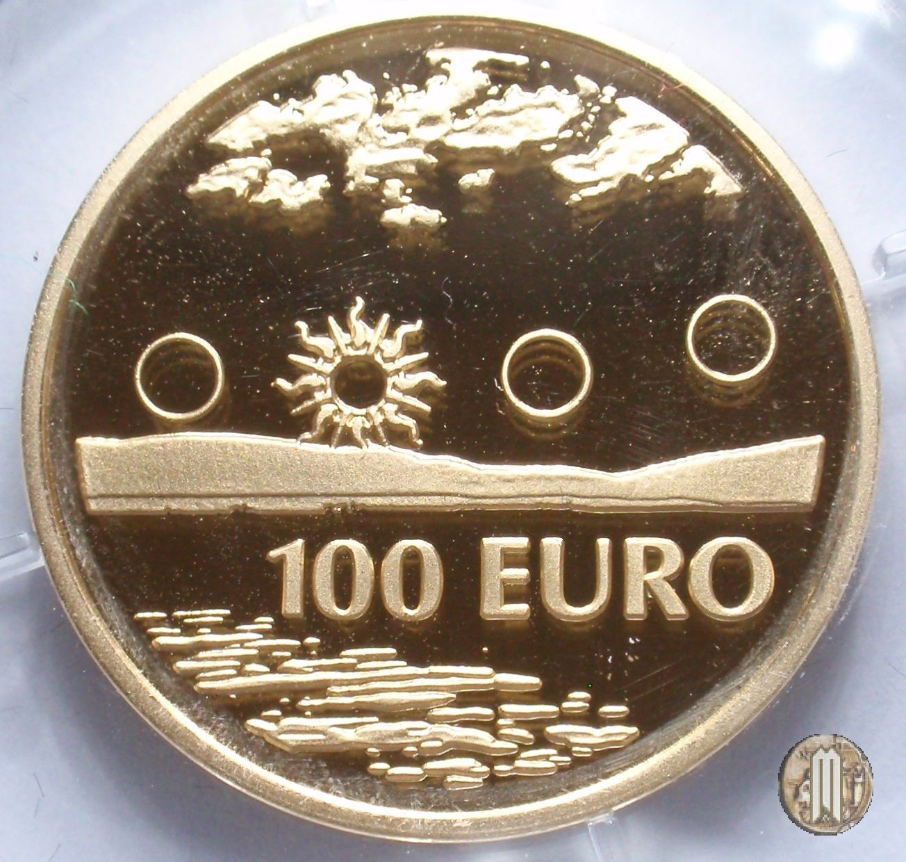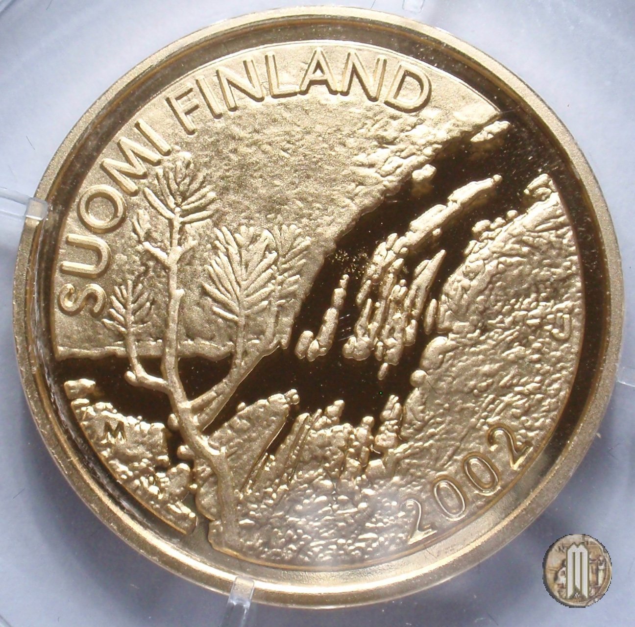 100 Euro 2002 Sole di Mezzanotte Dritto: Paesaggio Lappone con una Cascata in una Foresta. Verso: Sole di Mezzanotte sopra un lago Lappone ed iscrizione: 100 Euro. | |