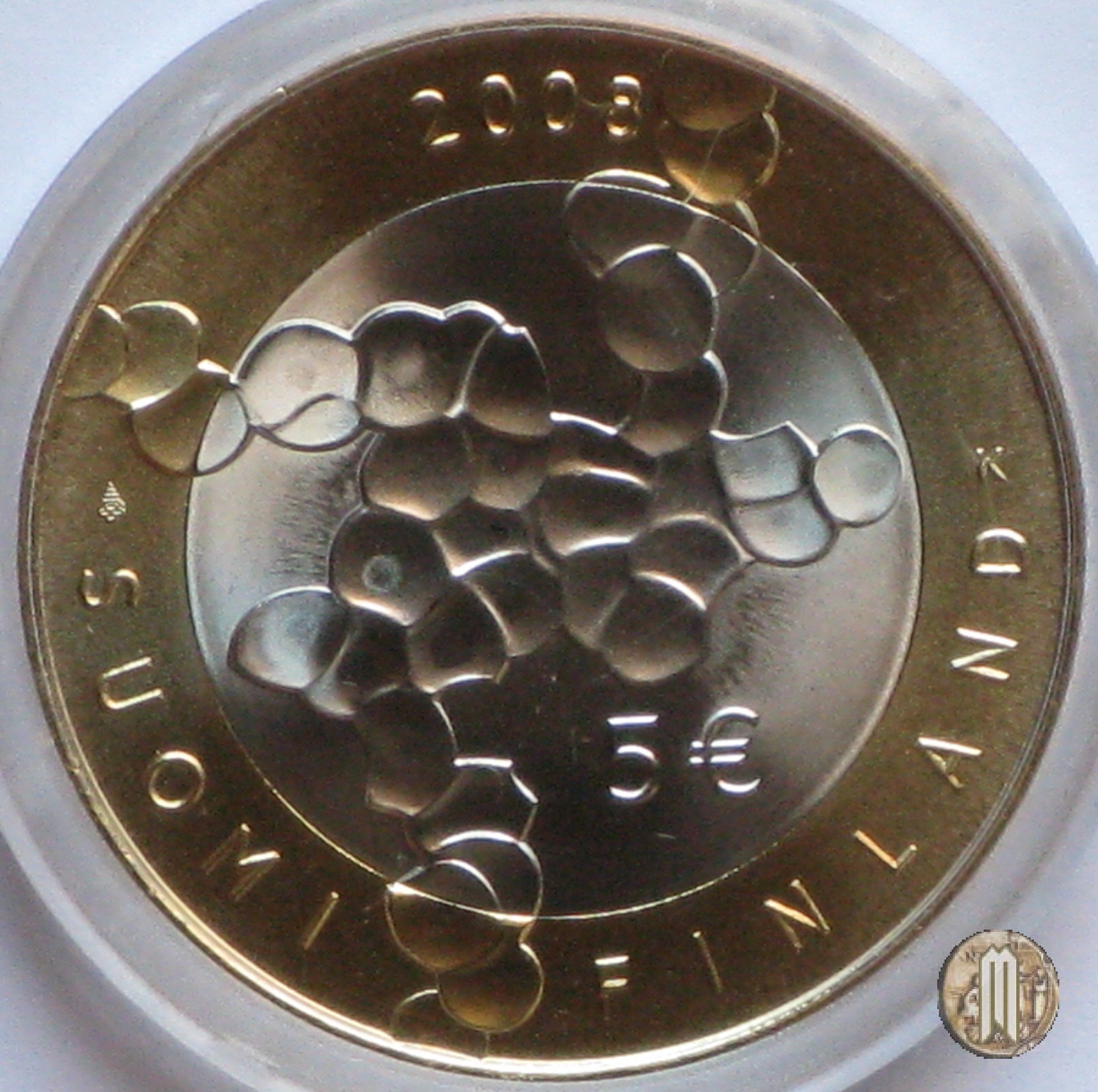 5 centesimi di Euro Dritto: Il Leone Araldico, simbolo dello stato, a sx del quale è il millesimo di conio. Sotto l'elsa della spada "M" (Direttore Zecca Makkonen Raimo). Intorno le 12 stelle simbolo della UE. Autore: Heikki Haivajoa. Dal 2007 sono state apportate lievi modifiche al conio del dritto: è apparso il segno "FI" a dx sotto la zampa del leone, e il segno di Zecca (una cornucopia) a sx della data; la "M" è scomparsa. Dal 2008 il segno di Zecca "FI" appare sotto l'elsa. | |