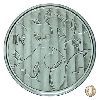 10 Euro 2005 60 Anni di Pace in Europa Dritto: Colomba che porta un ramoscello nel becco; sotto la catena spezzata da cui la colomba è divenuta libera. ![]() ![]() Verso: La parte inferiore simboleggia il terreno liscio ed il periodo di guerra, mentre la parte superiore rappresenta il cielo luminoso e la pace. | |