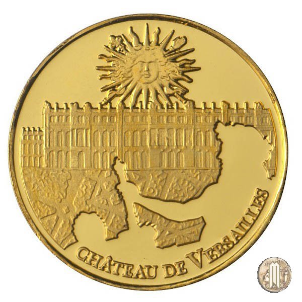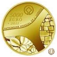 5000 Euro 2011 Unesco - Le Château de Versailles Dritto: Nella parte centrale della moneta è raffigurato l'edificio principale del castello, sopra è rappresentato il sole. Sotto il castello i giardini alla francese e il profilo di Nettuno, la scritta "CHATEAU DE VERSAILLES" appare, in circolo, nella parte inferiore. Verso: Retro: una veduta aerea della sede parigina dell'UNESCO divide la moneta in tre parti. Il primo promuove il patrimonio architettonico simboleggiato da pietre, il secondo simboleggiata dalla flora naturale e nell'ultimo contiene il valore nominale, le parole "PATRIMOINE MONDIAL DE L'UNESCO" e il logo dell'istituzione, il valore facciale, l'anno di coniazione e i segni di zecca. | |