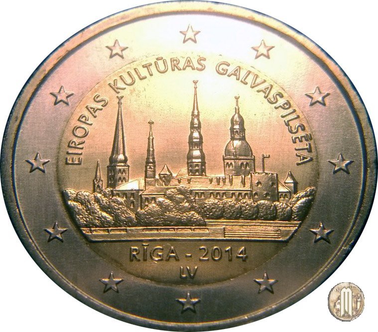 2 Euro 2014 Riga capitale europea della cultura Dritto: Al centro panorama del centro storico di Riga. Sopra iscrizione: "EIROPAS KULTURAS GALVASPILSETA" In basso: "RIGA - 2014" "LV" Sul perimetro esterno 12 stelle. | |