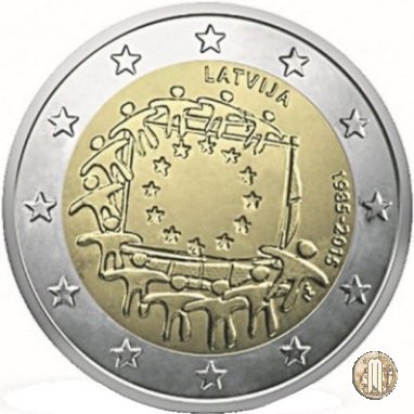 2 Euro 2015 30° Anniversario della bandiera europea Dritto: Al centro della moneta è raffigurata la bandiera dell'UE quale simbolo dell'unione di popoli e culture che condividono visioni e ideali per un futuro comune migliore. Le dodici stelle che si trasformano in figure umane rappresentano la nascita di una nuova Europa. In alto a destra figurano, a semicerchio, il paese di emissione "LATVIJA" e gli anni "1985-2015". In basso a destra le iniziali dell'autore Georgios Stamatopoulos. Sul bordo esterno 12 stelle a cinque punte rappresentanti l'Unione Europea. Verso: faccia comune | |