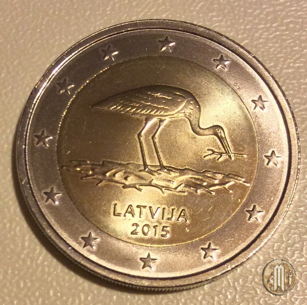 2 Euro 2015 Cicogna Dritto: Al centro della moneta una cicogna. In basso la scritta "LATVIJA 2015". Sul bordo esterno 12 stelle a cinque punte rappresentanti l'Unione Europea Verso: faccia comune | |