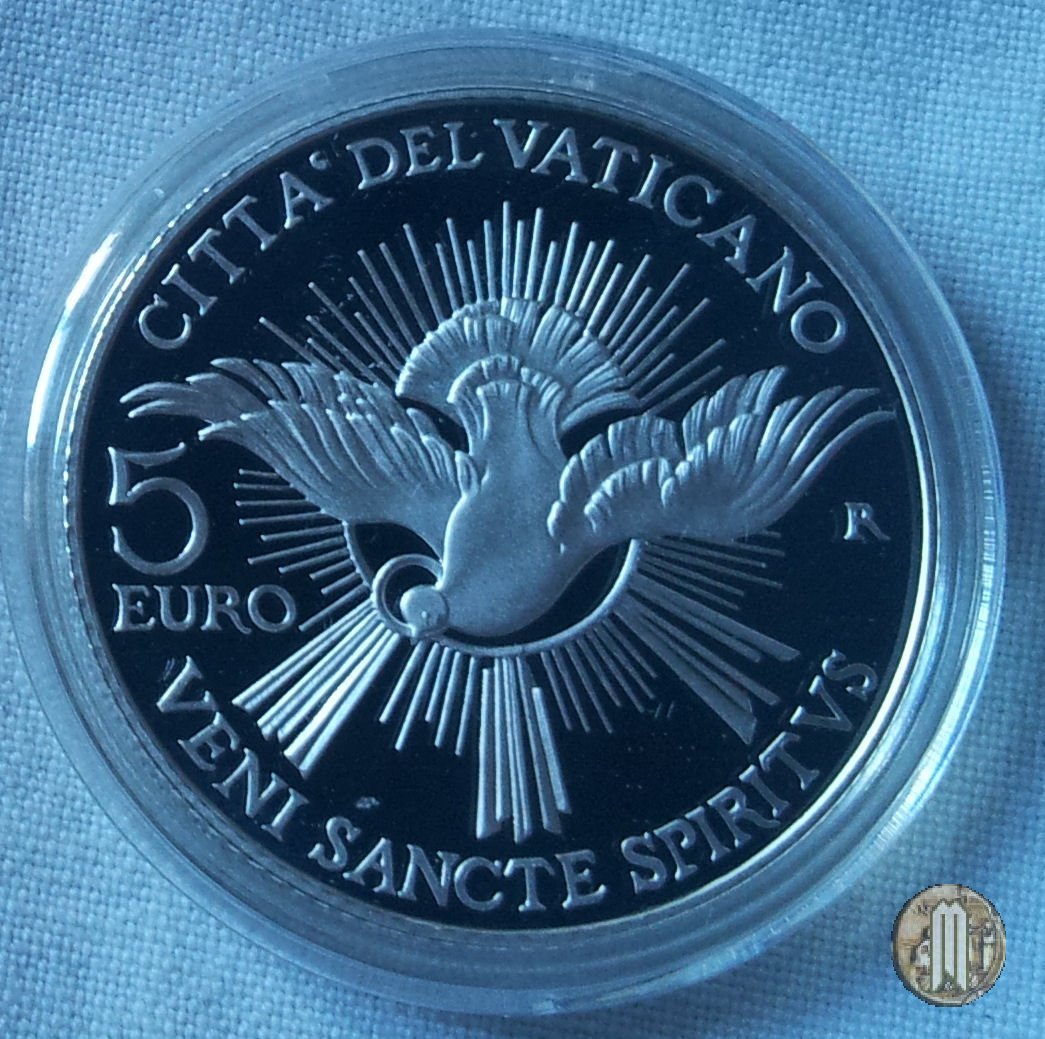 5 Euro 2013 Sede Vacante Dritto: Al centro lo stemma del Camerlengo sormontato dal simbolo della Camera Apostolica; nel giro "SEDE • VACANTE • MMXIII"; in basso il nome dello scultore "M. CRISCIOTTI" e quello dell'incisore "U. PERNAZZA INC.". Verso: Al centro la Colomba dello Spirito Santo; in alto "CITTA' DEL VATICANO"; in basso "VENI SANCTE SPIRITVS"; sulla sinistra il valore "5 EURO"; sulla destra il segno della Zecca "R". | |