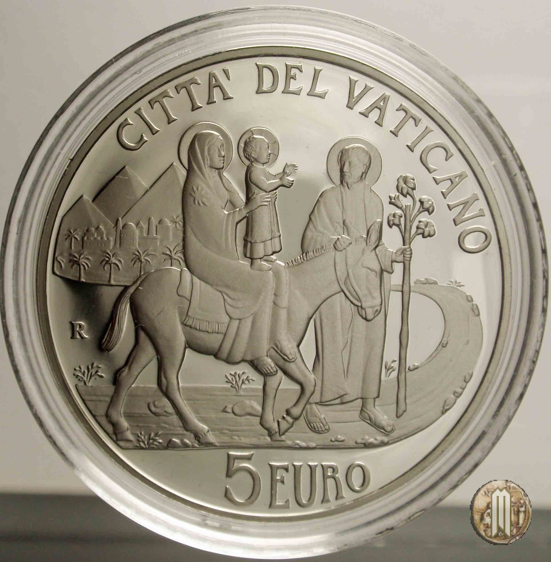 5 Euro 2010 96^ Giornata Mondiale del Migrante e del Rifugiato Dritto: BENEDICTVS XVI PONT.MAX. _ ANNO VI _ MMX / Immagine del Santo Padre in piedi di tre quarti con il volto rivolto leggermente a sinistra. Verso: CITTA' DEL VATICANO - 5 EURO / Gesú e Maria a dorso di un asino assieme a Giuseppe in fuga verso l'Egitto. | |