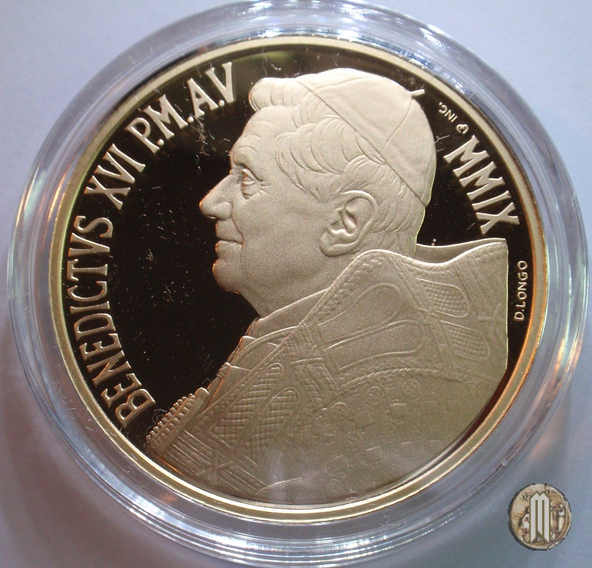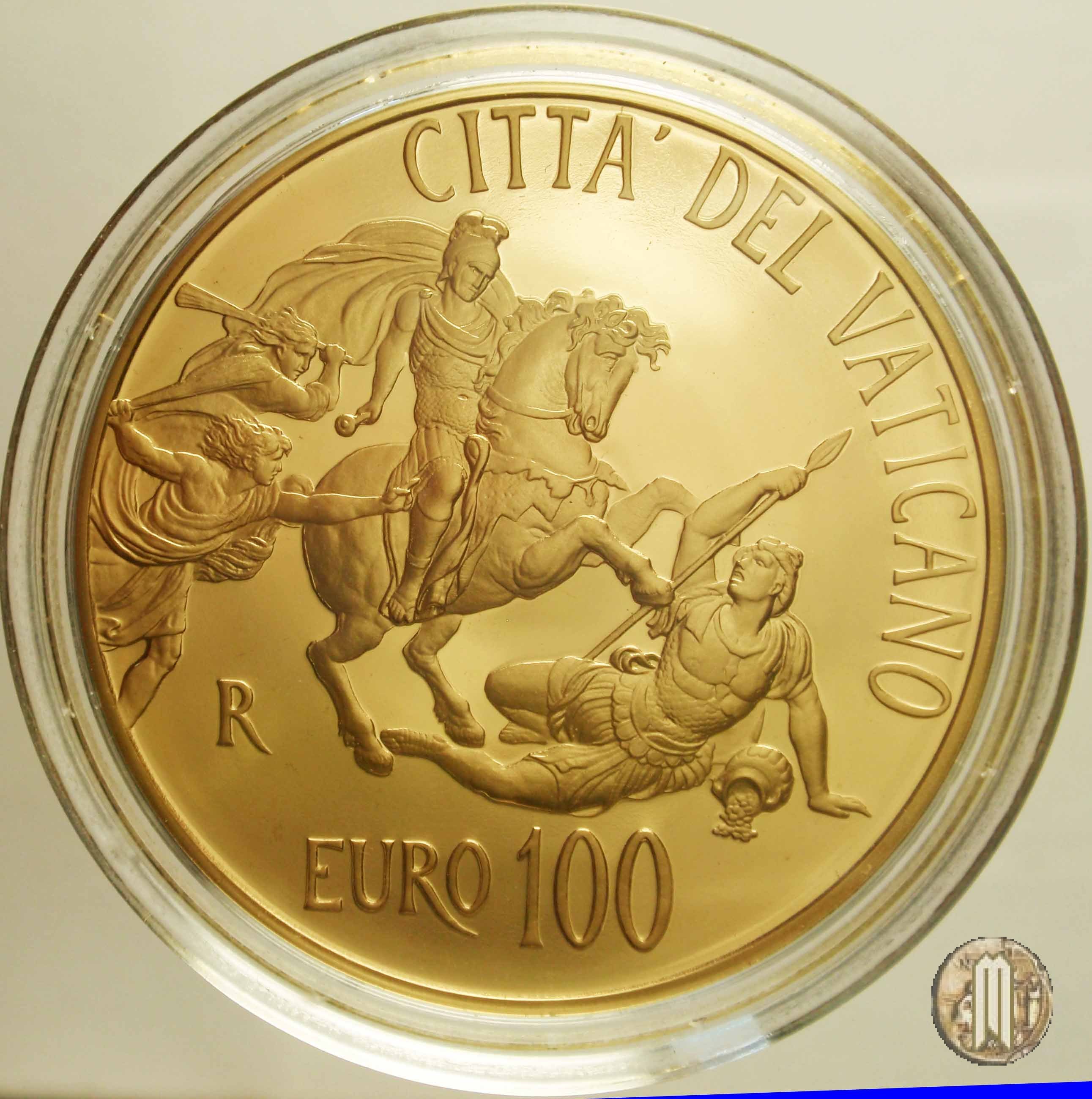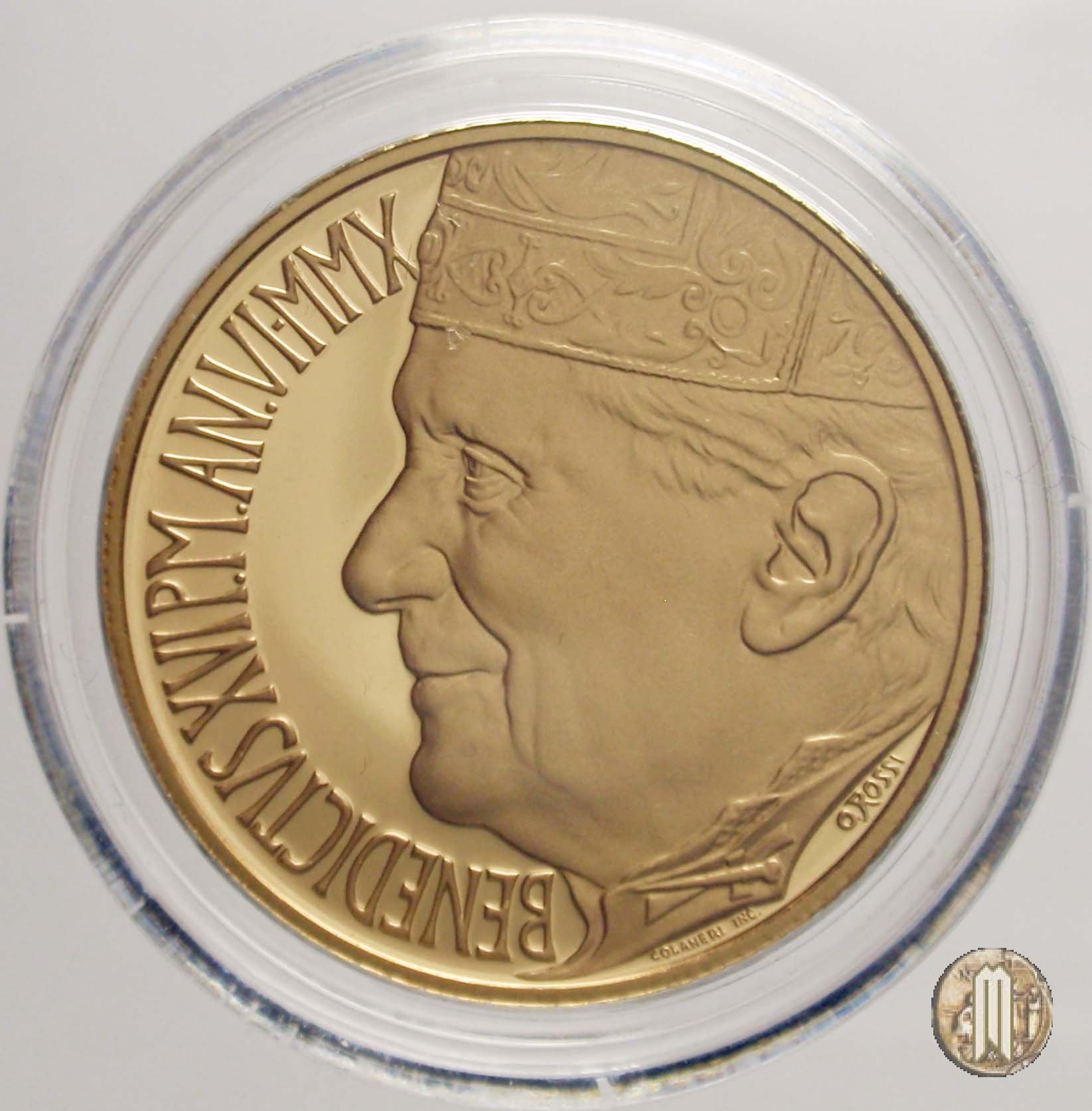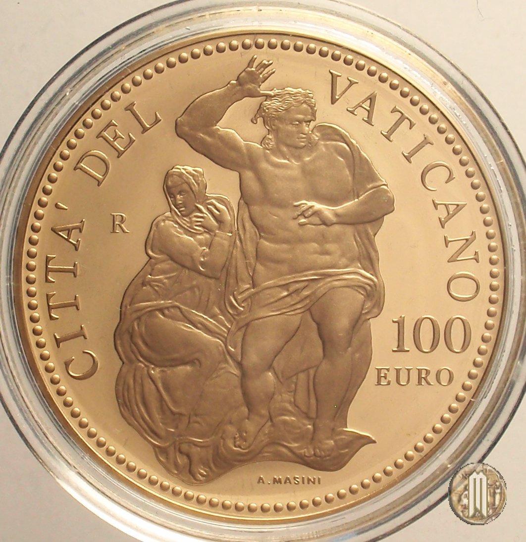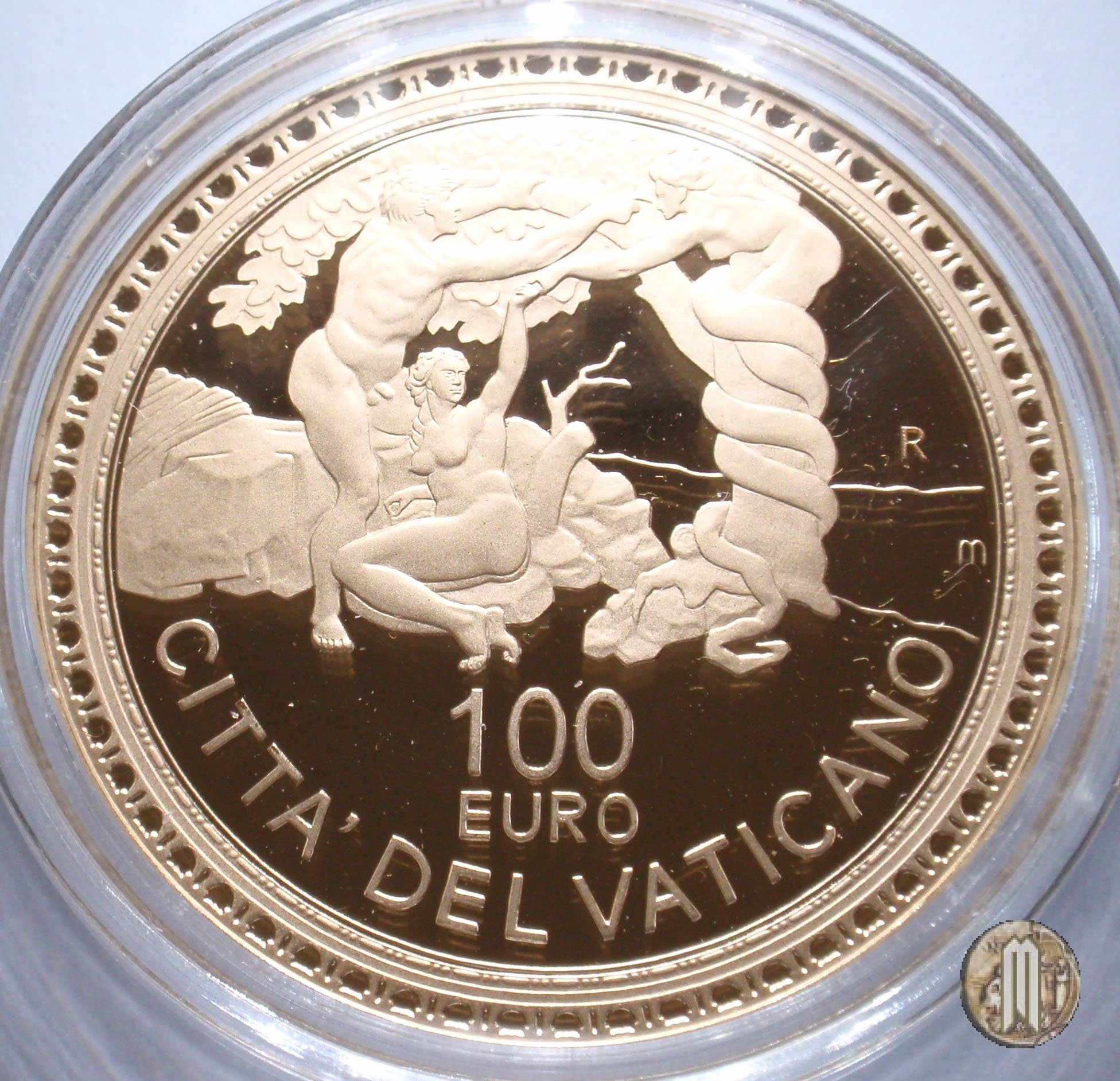 100 Euro 2009 Cappella Sistina - Cacciata dal Paradiso Dritto: Immagine di Papa Benedetto XVI. Iscrizioni: BENEDICTUS XVI PONT.MAX. ANNO V MMIX Verso: Particolare della cacciata di Adamo ed Eva dal paradiso terrestre tratto da uno degli affreschi di Michelangelo sulla volta della Cappella Sistina. Iscrizioni: CITTA' DEL VATICANO 100 euro | |