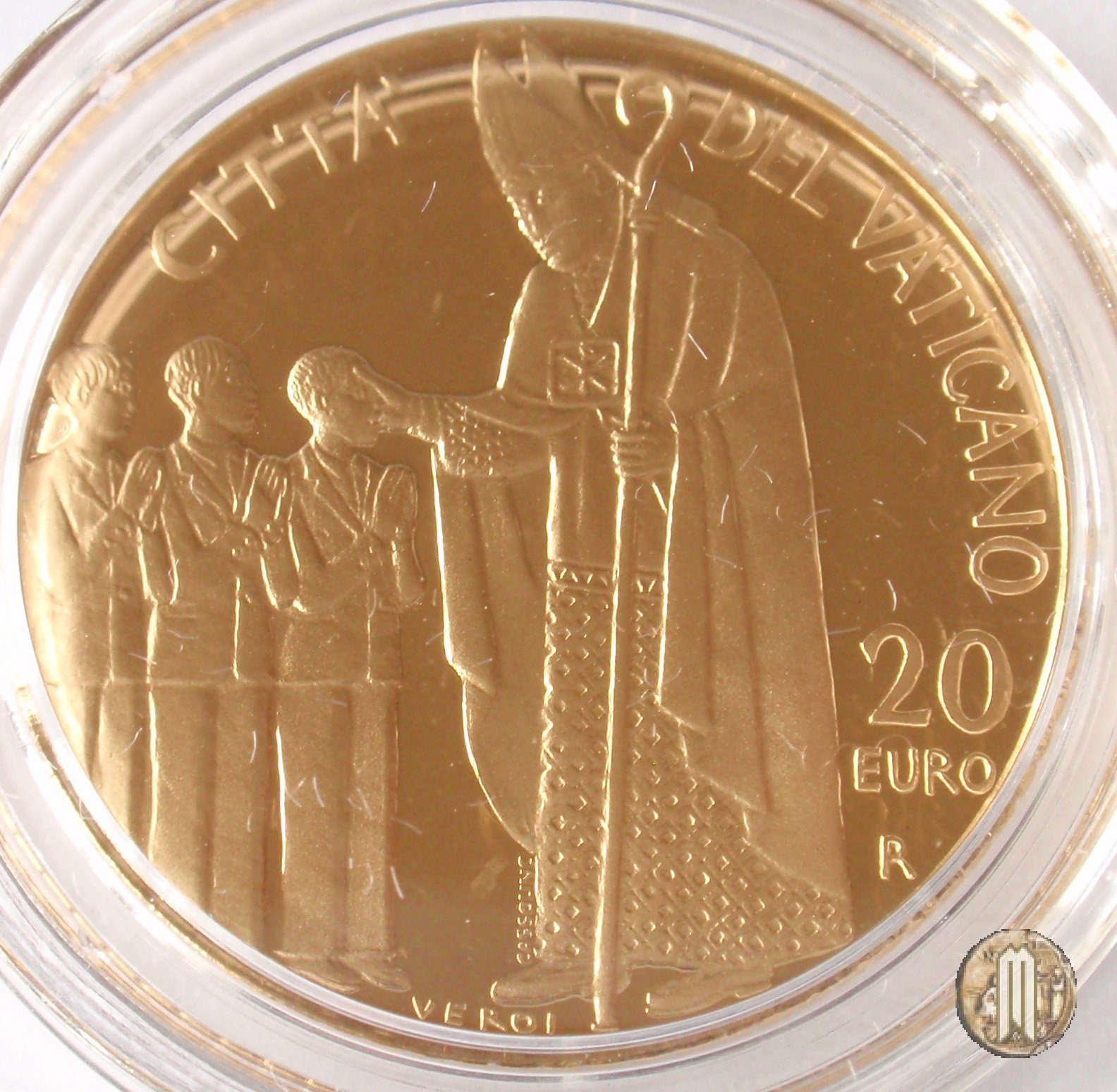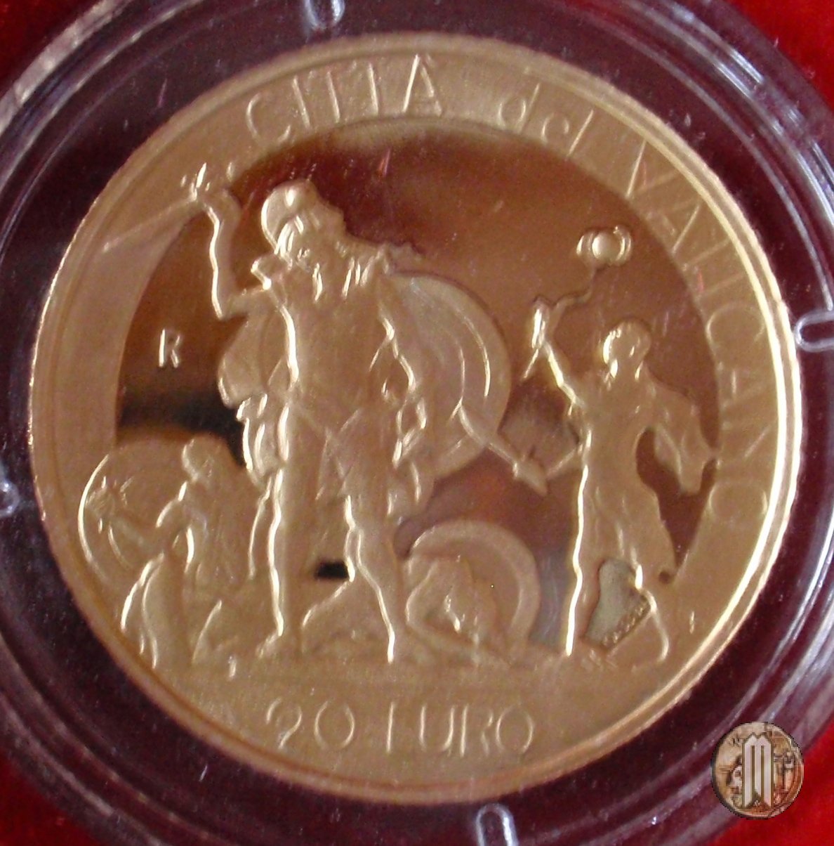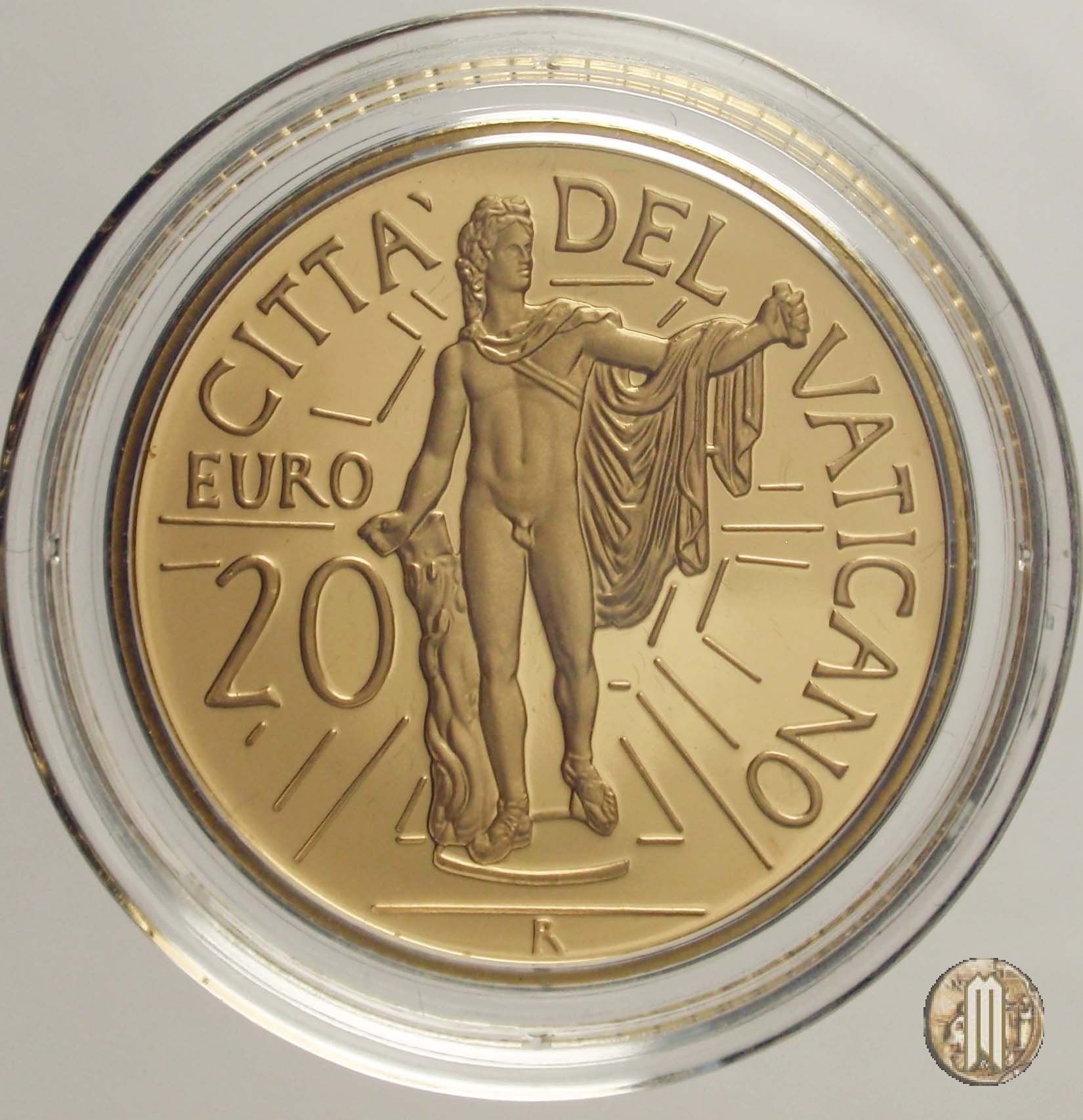20 Euro 2010 Capolavori Scultura in Vaticano - Apollo del Belvedere Dritto: BENEDICTVS XVI P.M.AN.VI-MMX / volto del Santo Padre rivolto a sinistra. Verso: CITTA' DEL VATICANO - 20 EURO / l'Apollo del Belvedere; la statua, che è copia di un bronzo greco del IV sec. a.c., risale al periodo adrianeo (130-140 d.c.) e fu trovata nella villa di Nerone ad Anzio. | |