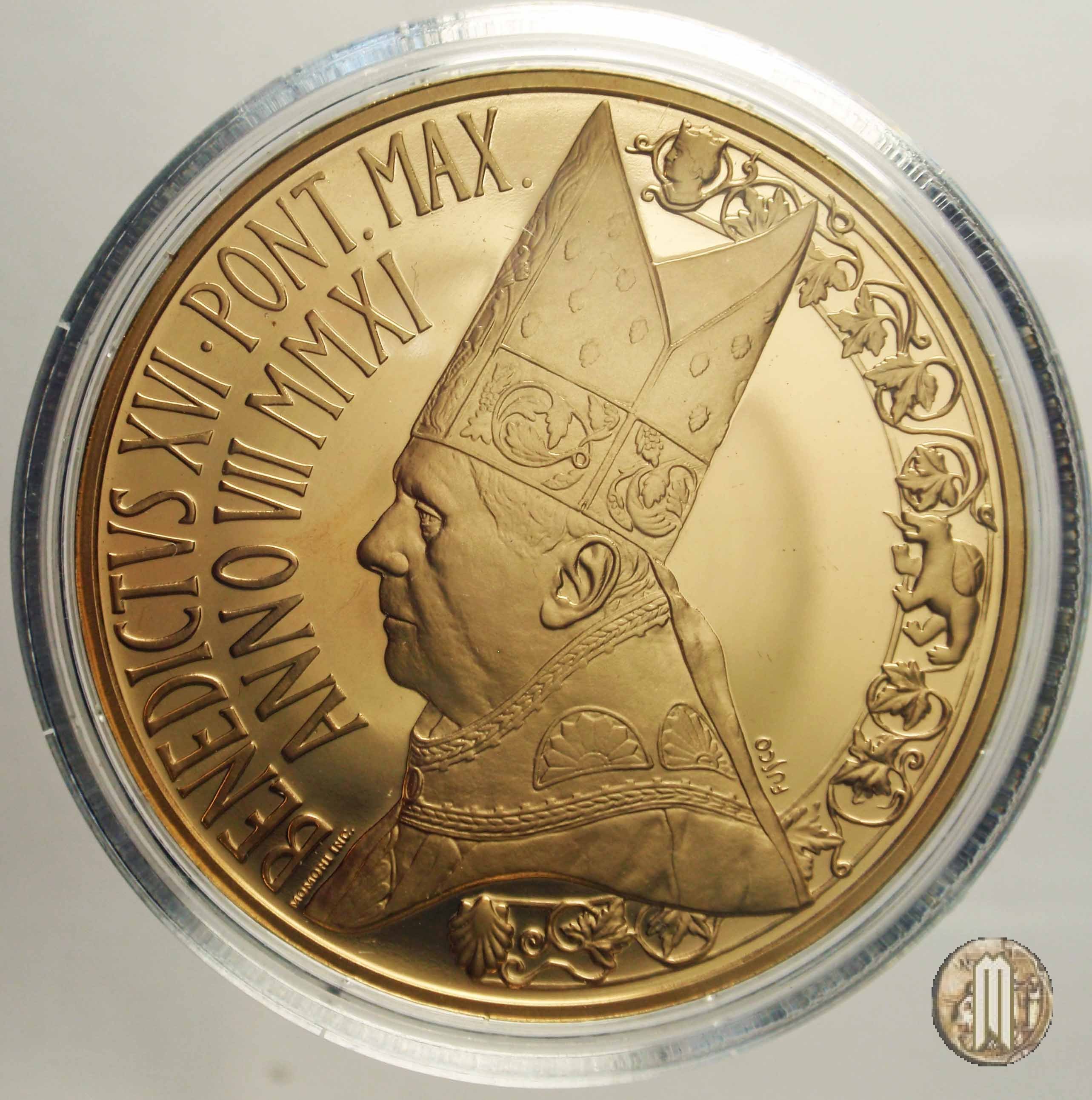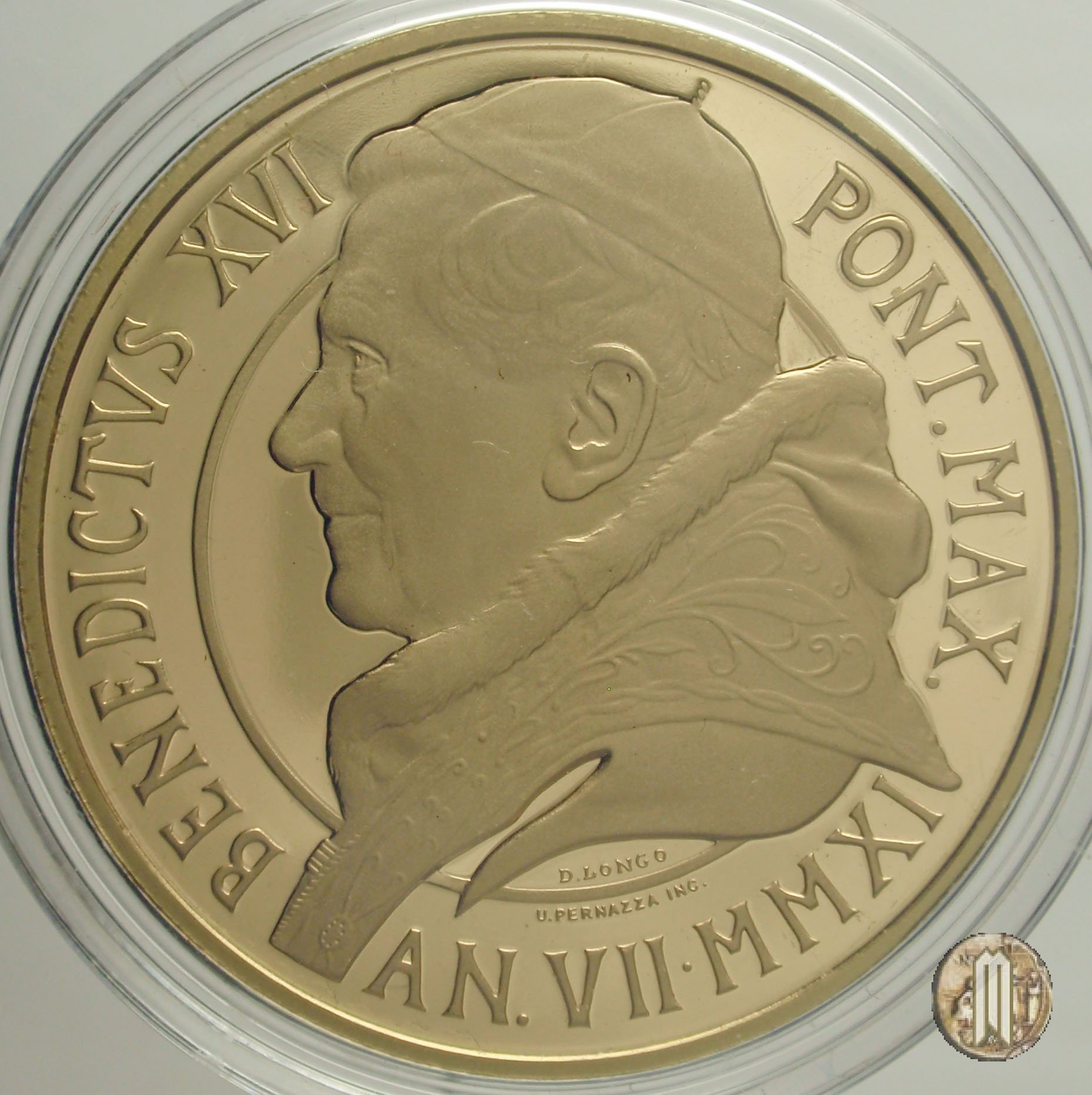 50 Euro 2011 La Cappella Paolina - La Crocifissione di San Pietro Dritto: Raffigurazione di Sua Santità Benedetto XVI, sul giro la legenda BENEDICTUS XVI PONT. MAX. AN. VII●MMXI, sotto il busto le firme dello scultore e dell'incisore. Verso: Riproduzione dall'affresco di Michelangelo "La Crocifissione di San Pietro". Sul campo superiore il segno di zecca, in basso il valore nominale; sul giro, da sinistra verso l'alto la legenda CITTA' DEL VATICANO, | |