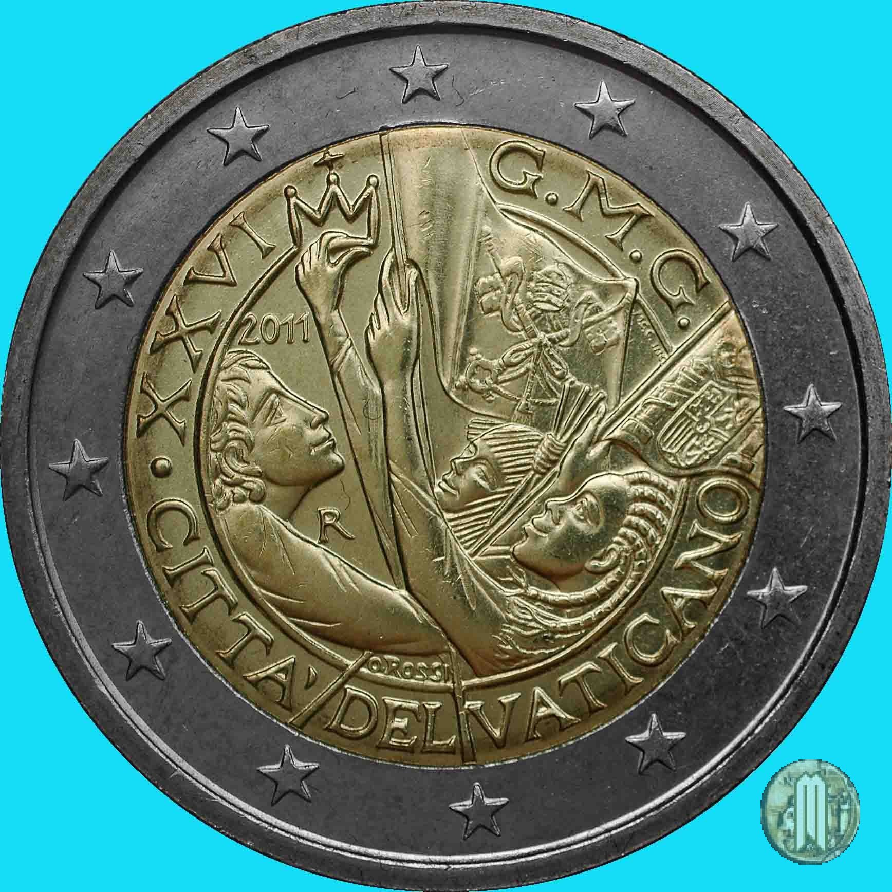 2 Euro 2011 XXVI Giornata Mondiale della Gioventú Dritto: La parte interna presenta alcuni giovani e bandiere; intorno le scritte “XXVI” “G.M.G.” “CITTA’ DEL VATICANO”. A sinistra il millesimo di conio “2011” e il segno di zecca “R”; a destra le iniziali dell’incisore Maria Carmela Colaneri “M.C.C. INC”; in alto il logo della manifestazione; in basso il nome dello scultore Orietta rossi “O.ROSSI”. Sul bordo esterno 12 stelle a cinque punte rappresentanti l'Unione Europea. Verso: Faccia comune, nuova mappa. | |