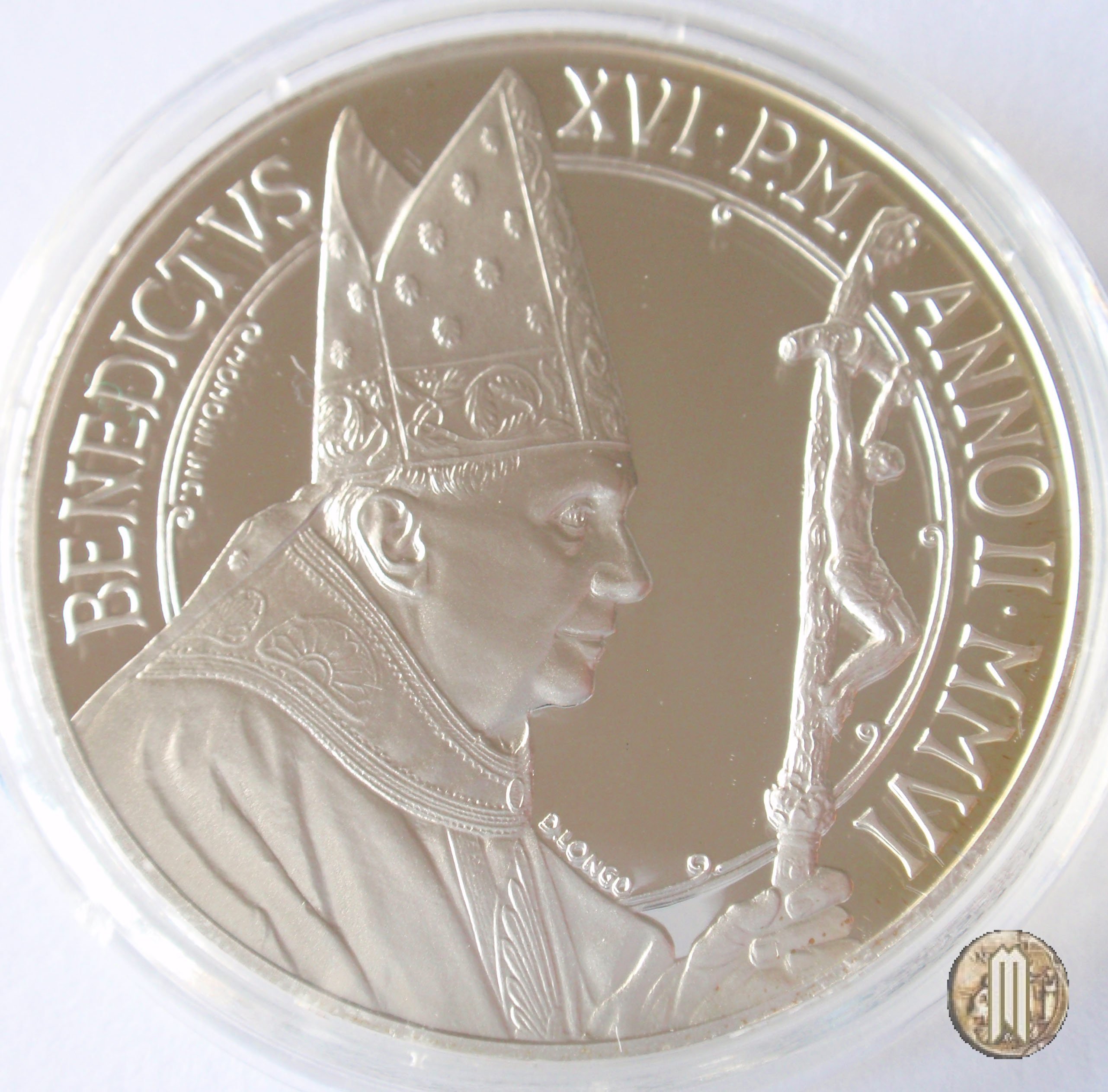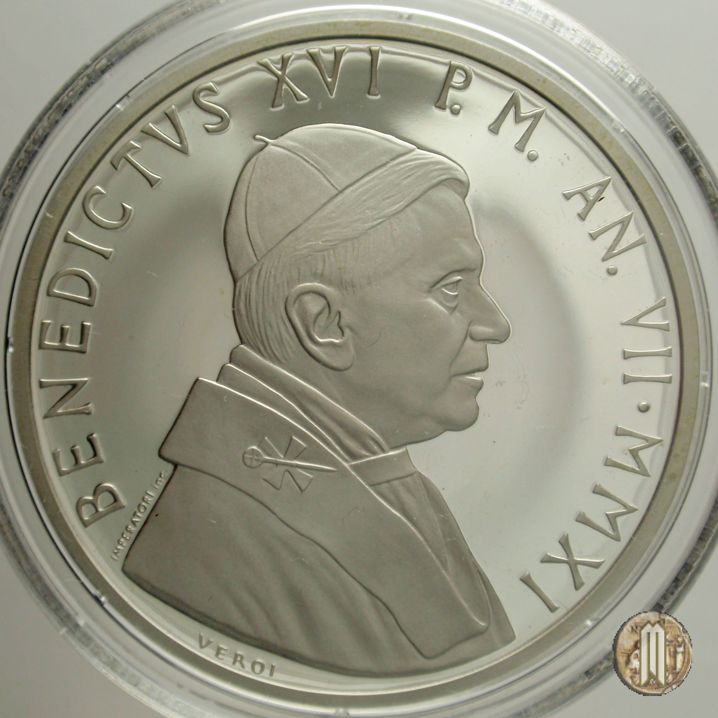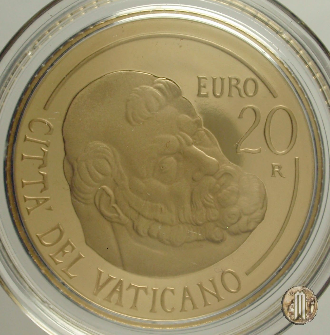 20 Euro 2011 La Cappella Paolina - La Crocifissione di San Pietro Dritto: Raffigurazione di Sua Santità Benedetto XVI, sul giro la legenda BENEDICTUS XVI PONT. MAX. AN. VII●MMXI, sotto il busto le firme dello scultore e dell'incisore. Verso: Riproduzione del volto di San Pietro, tratto dall'affresco di Michelangelo "La Crocifissione di San Pietro". A destra del campo superiore la legenda EURO sotto il valore nominale e il segno di zecca; sul giro, da sinistra verso il basso, la legenda CITTA' DEL VATICANO, | |