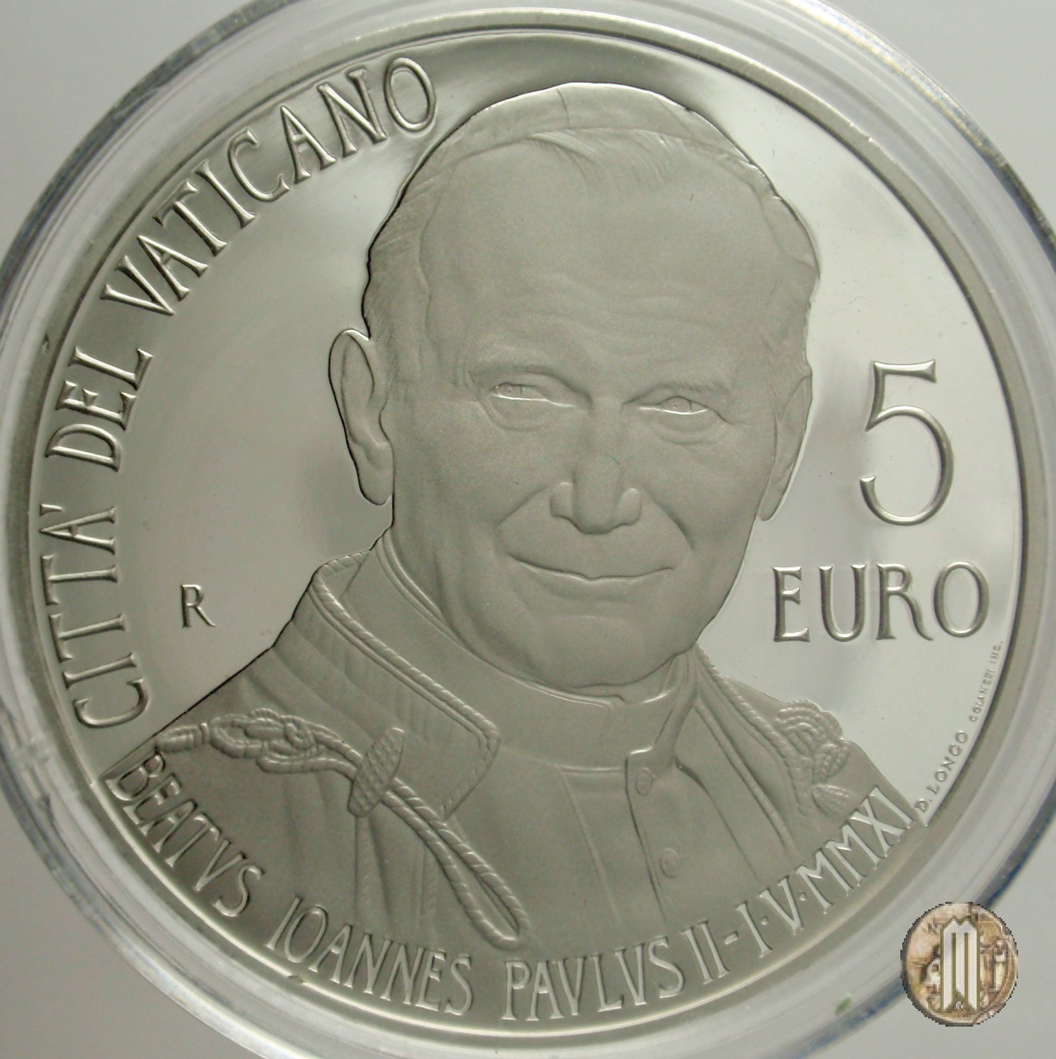 5 Euro 2011 Beatificazione di Papa Giovanni Paolo II Dritto: Al centro raffigurazione di Sua Santità Giovanni Paolo II. Alla sua destra il valore nominale a sinistra il segno di zecca, sul giro a sinistra la leggenda CITTA' DEL VATICANO, sotto BEATUS 10 ANNES PAULUS II •I •V MMXI, segue la firma dello scultore. Verso: Riproduzione dello stemma di Benedetto XVI, sul giro alto la legenda BANEDICTUS XVI P.M., sotto la legenda ANNO VII - MMXI | |