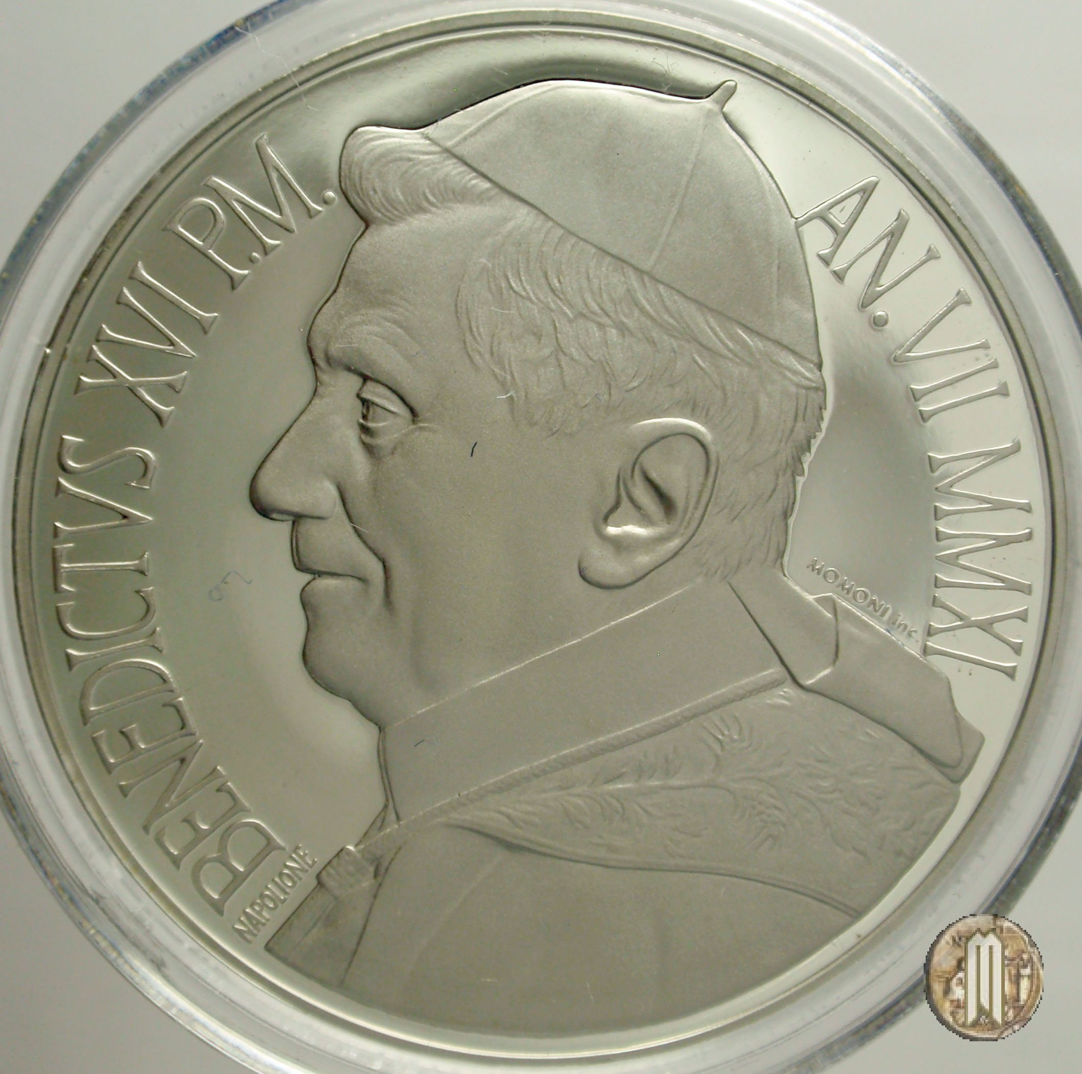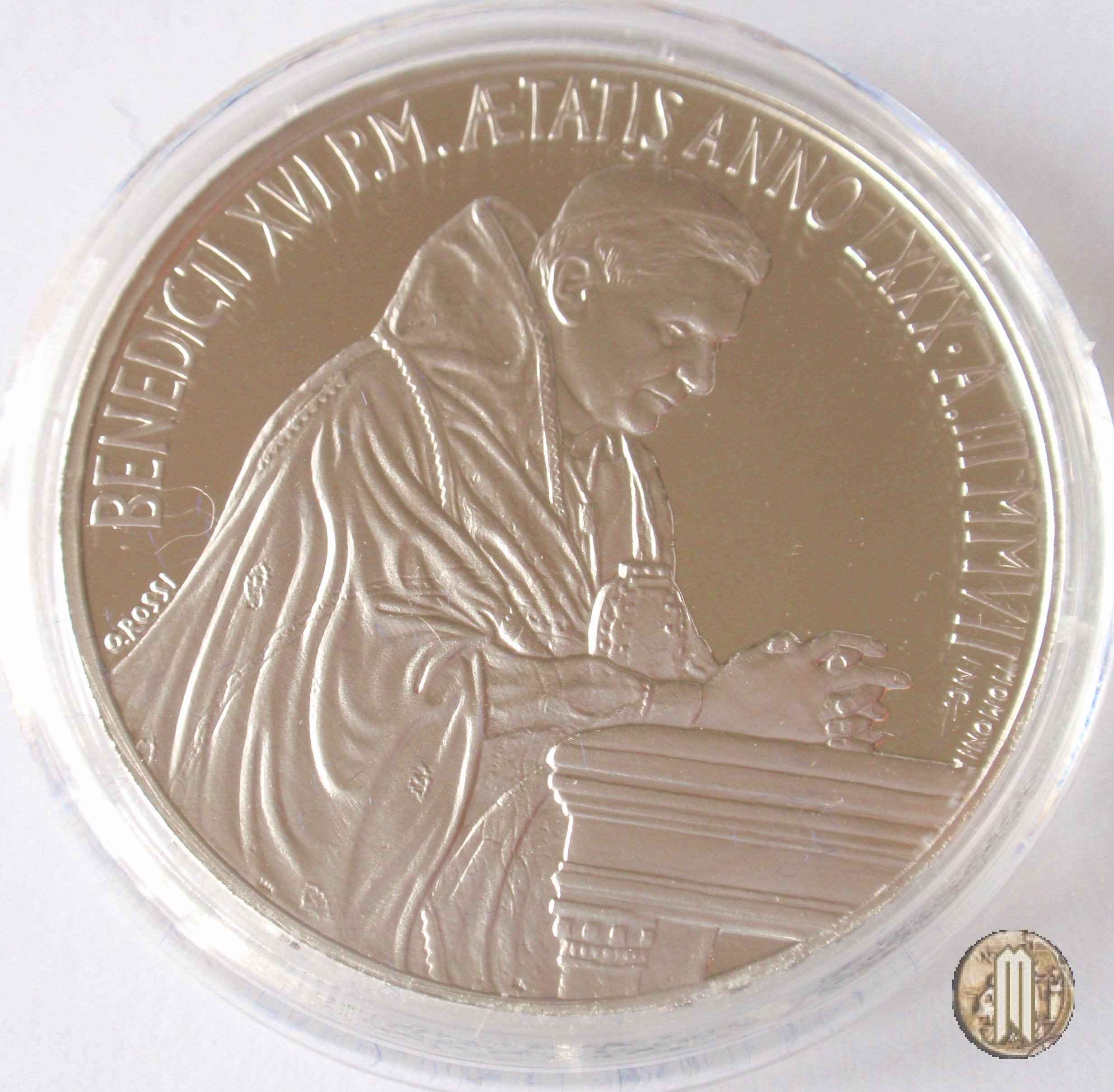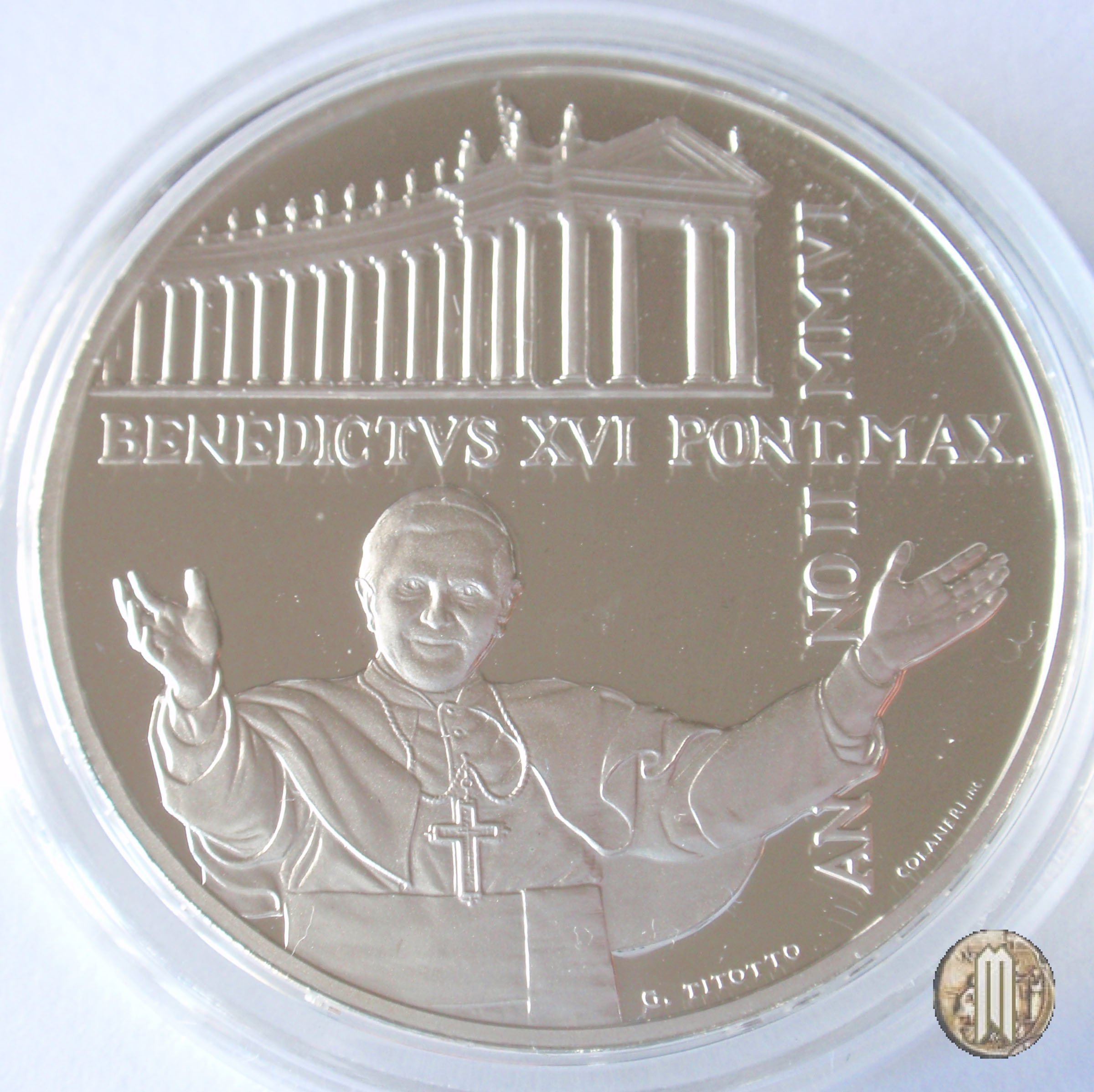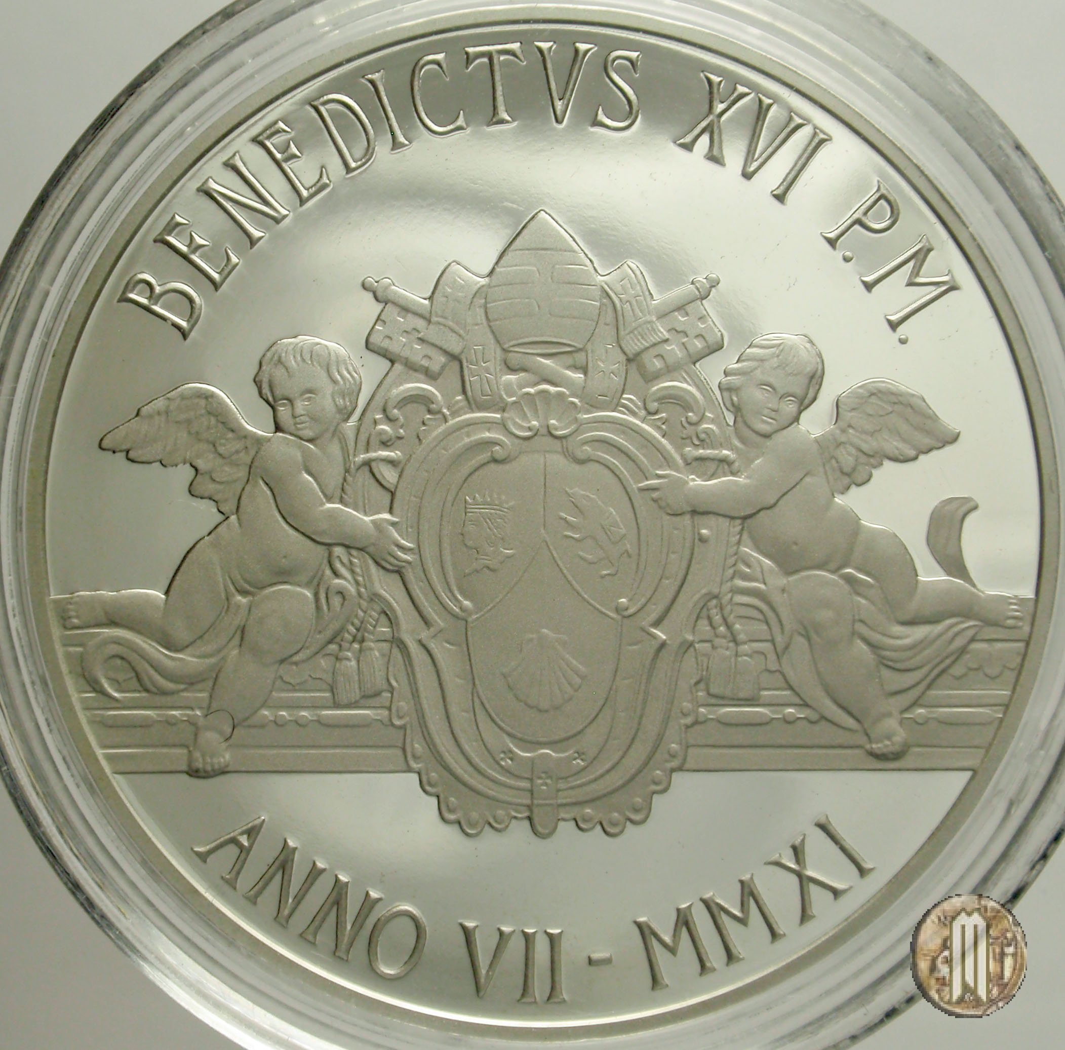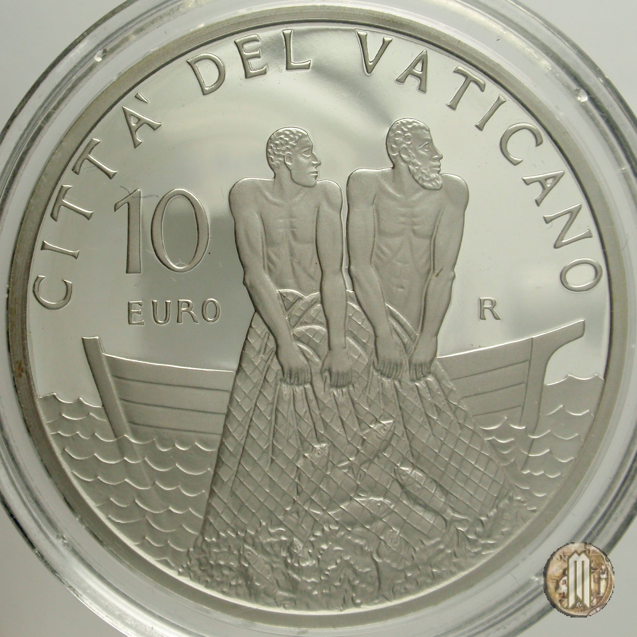 10 Euro 2011 60° anniversario dell'Ordinazione Sacerdotale di Benedetto XVI Dritto: Raffigurazione di Sua Santità Benedetto XVI rivolto verso a destra, sul giro la legenda BENEDICTUS XVI P.M. AN. VII •MMXI, sotto il busto la firma dello scultore e a sinistra quella dell'incisore. Verso: Sulla moneta sono rappresentati gli apostoli Pietro e Andrea raffigurati durante la pesca che guardano verso la sponda quando Gesú li chiama. Sul campo a sinistra il valore nominale e a destra il segno di zecca, sul giro alto la legenda CITTA' DEL VATICANO. | |