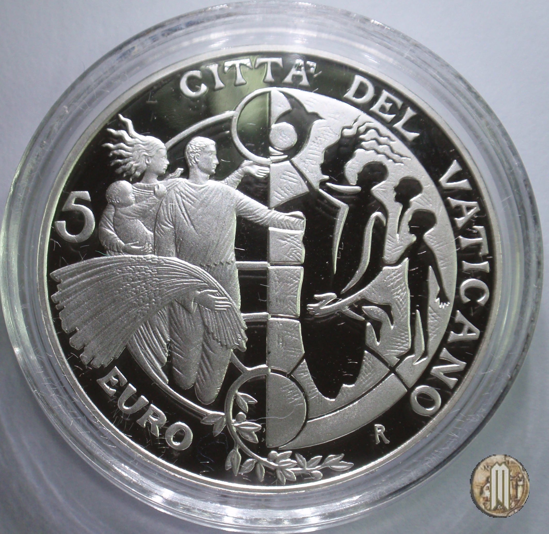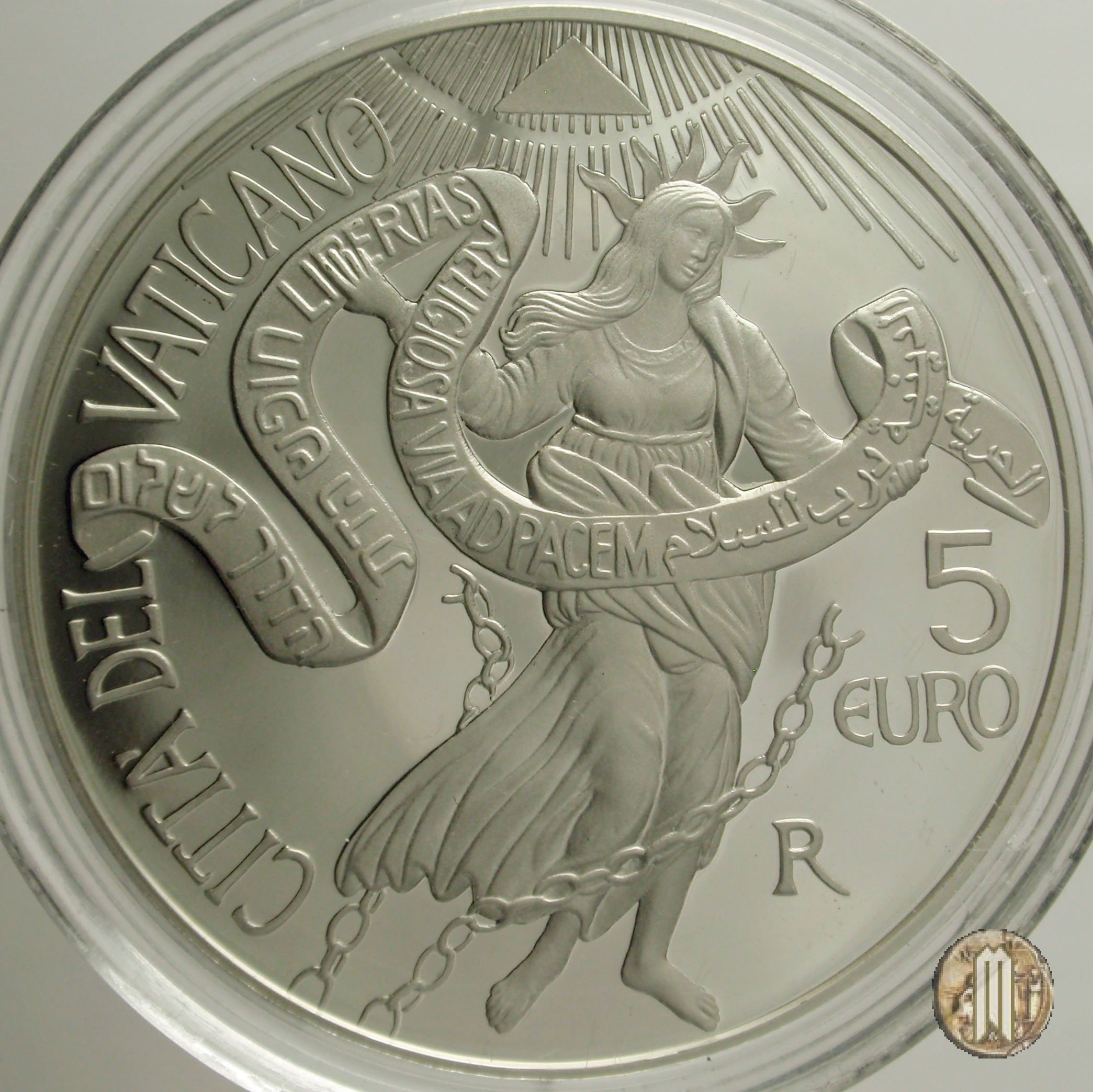 5 Euro 2011 XLIV Giornata Mondiale della Pace "Libertà religiosa, via per la pace" Dritto: Raffigurazione di Sua Santità Benedetto XVI volto verso sinistra, sul giro a sinistra la legenda BENEDICTUS XVI P.M., a destra la legenda AN. VII MMXI, in basso seguendo il profilo del busto a sinistra il nome dello scultore a destra quello dell'incisore. Verso: Raffigurazione di una figura di donna che simboleggia la religione che spezza le catene e illuminata dalla luce di Dio, essa tiene tra le mani un cartiglio che reca la scritta "Libertà religiosa, via per la pace" in latino, arabo ed ebraico, a simboleggiare le tre grandi religioni monoteistiche, a destra il valore nominale sotto il segno di zecca, sul giro la legenda CITTA' DEL VATICANO. | |