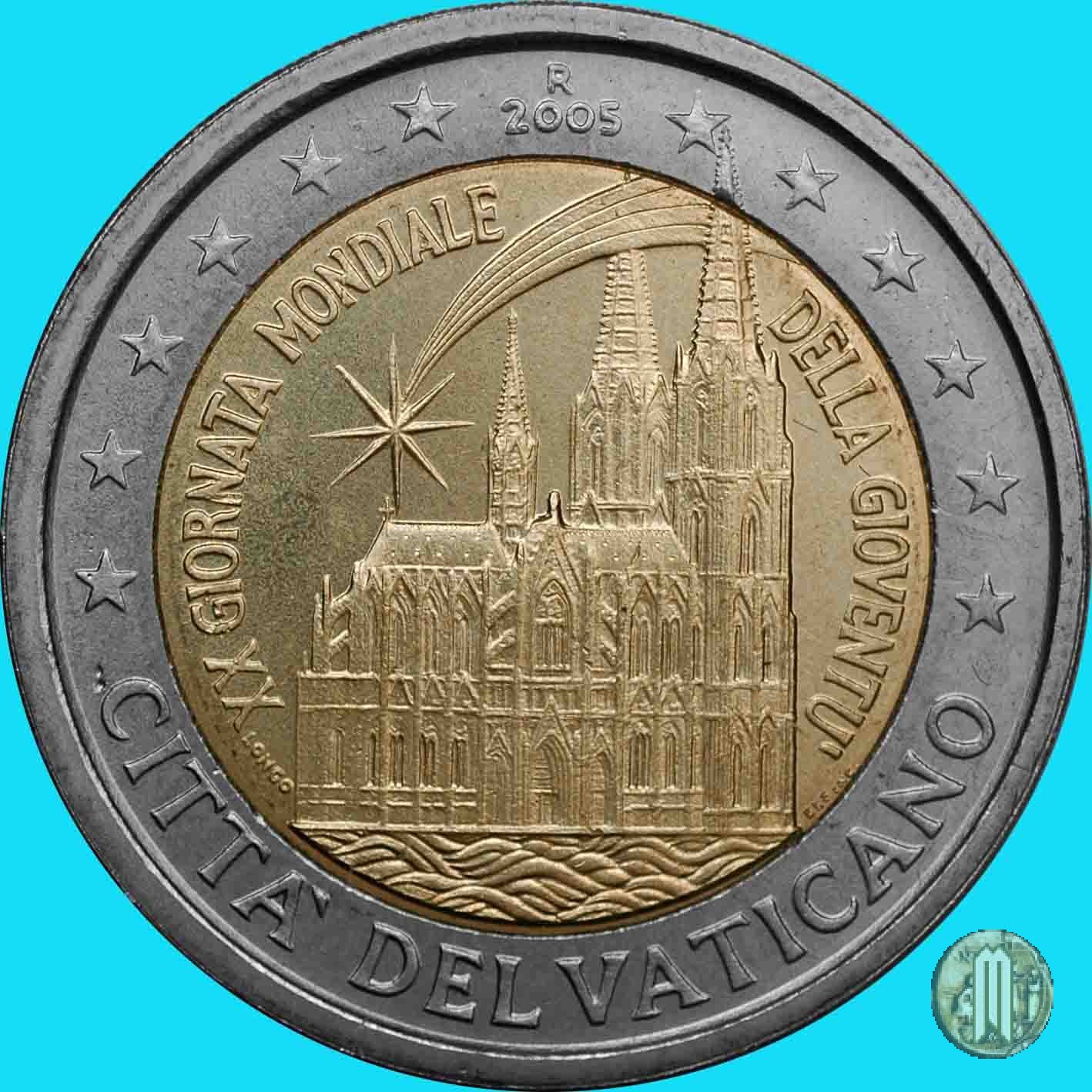 2 Euro 2005 XX Giornata Mondiale della Gioventú Dritto: Al centro la cattedrale di Colonia sovrastata da una stella cometa andante verso sinistra; intorno "XX GIORNATA MONDIALE DELLA GIOVENTU'". Alla destra e alla sinistra della Cattedrale la firma dell'autore e dell'incisore "LONGO" e "E.L.F.INC.". Intorno, nella metà superiore, le 12 stelle dell'UE separate ad ore 6 dal segno di Zecca "R" e il millesimo "2005"; sotto "CITTA' DEL VATICANO". Verso: Faccia comune | |