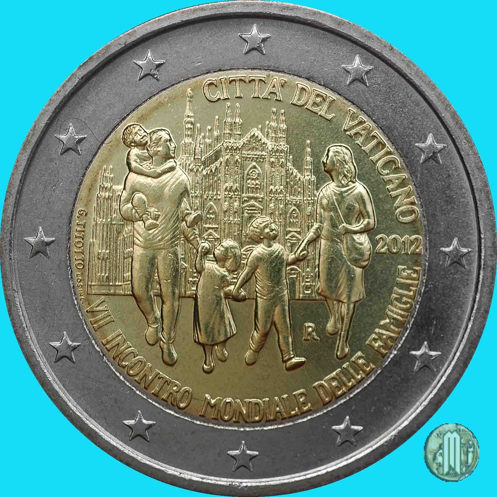 2 Euro 2012 VII Incontro Mondiale delle Famiglie Dritto: Nel diritto di tutte le monete è raffigurata leffigie di Sua Santità Benedetto XVI, Sovrano dello Stato della Città del Vaticano, la scritta « CITTA DEL VATICANO » e dodici stelle. Verso: Faccia comune, nuova mappa. | |